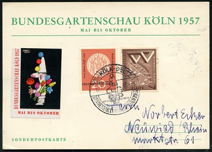 8954 | 18 € | 5000 KÖLN (Sonder- und Handwerbe-Stempel) : (22c) KÖLN-DEUTZ/ b/ BUNDESGARTENSCHAU 1957 (15.7.) SSt mit UB "b" = Clown mit Blumen + motivgl. Ausst.-Vignette auf passender Sonder-Kt.: BUNDESGARTENSCHAU KÖLN 1957, Bedarf! (Bo.135 b) | ![]() | |