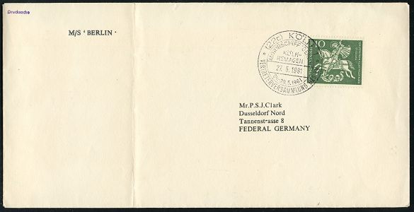 8959 | 18 € | 5000 KÖLN (Sonder- und Handwerbe-Stempel) : (22c) KÖLN/ MOTORSCHIFF "BERLIN"/ KÖLN-/ REMAGEN/ VERTRETERVERSAMMLUNG DES KV 1961 (27.5.) seltener SSt = Sonder-Bordpostamt Rheindampfer "Berlin" , klar gest. Vordruck-Bf.: M/S "Berlin" (links gefaltet) klar gest. Inl.-Bf. (Bo.188, nur am 27.5.) | ![]() | |