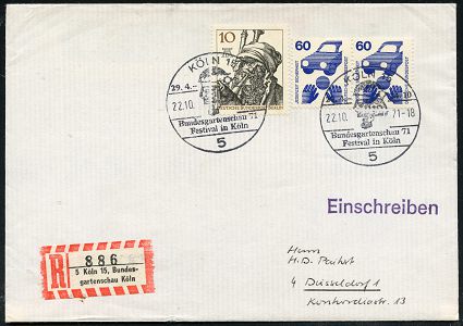 8963 | 20 € | 5000 KÖLN (Sonder- und Handwerbe-Stempel) : 5 KÖLN 15/ Bundesgartenschau´71.. 1971 (22.10.) SSt (Ausstellungs-Logo) + Sonder-RZ: 5 Köln 15, Bundes-/gartenschau Köln (NEZ-Katalog Nr.130) klar gest. Inl.-R-Bf. (Bo.313) | ![]() | |