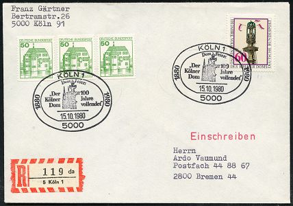 8964 | 18 € | 5000 KÖLN (Sonder- und Handwerbe-Stempel) : 5000 KÖLN 1/ 1880/ Der/ Kölner/ Dom/ 100/ Jahre/ vollendet 1980 (15.10.) SSt = Dom u. Turmspitze (Abschlußstein) 2x auf 60 Pf. Kölner Dom (Mi.1064 u.a.) + RZ: 5 Köln 1/d a, klar gest. Inl.-R-Bf., vergl. Kat.-Nr. 8923 (Bo.403) | ![]() | |