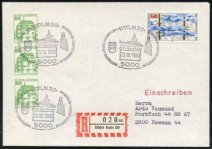 8965 | 16 € | 5000 KÖLN (Sonder- und Handwerbe-Stempel) : 5000 KÖLN 30/ 1.KÖLNER SCHIFFSPOST-AUSSTELLUNG IM ALBERTUS-MAGNUS-GYMNASIUM 1980 (25.10.) SSt = Fregatte "Köln" (u. Domsilhouette, Stadtwappen) 3 x klar auf Inl.-R-Bf. (Bo.405) | ![]() | |