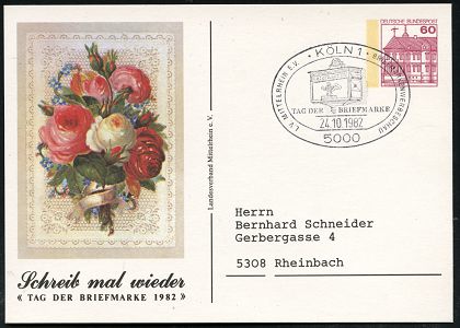 8966 | 8 € | 5000 KÖLN (Sonder- und Handwerbe-Stempel) : 5000 KÖLN 1/ TAG DER BRIEFMARKE 1982 (24.10.) SSt. a. PP 60 Pf. Burgen: "T.d.B." (Zierbrief m. Rosen) (Mi. PP 106/94) | ![]() | |