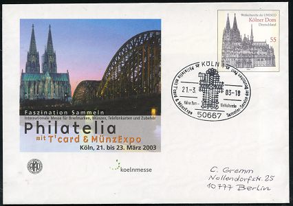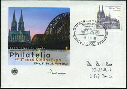8970 | 5 € | 5000 KÖLN (Sonder- und Handwerbe-Stempel) : 50667 KÖLN 1/ Sonderschau "Oldtimer"/ Philatelia.. 2003 (23.3.) SSt = Mercedes Benz "300 SL" auf passendem USo 55 C. "Kölner Dom": Philatelia.. 2003 (Dom, Rheinbrücke), Inl.-Bf. (Mi.USo 55) | ![]() | |