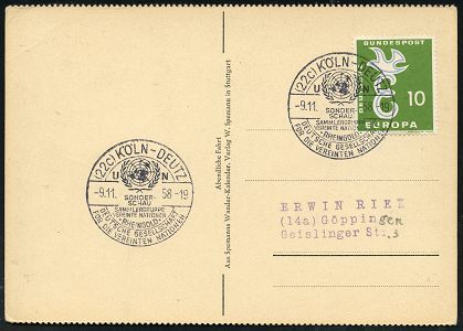 8956 | 15 € | 5000 KÖLN (Sonder- und Handwerbe-Stempel) : (22c) KÖLN-DEUTZ/ UN/ SONDER-/ SCHAU.."RHEINGOLD"/ DEUTSCHE GESELLSCHAFT/ FÜR DIE VEREINTEN NATIONEN 1958 (9.11.) SSt = UN-Logo , 2x klar auf Inl.-Karte (Bo.153) | ![]() | |