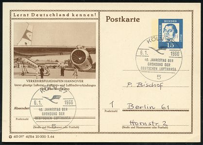 8962 | 15 € | 5000 KÖLN (Sonder- und Handwerbe-Stempel) : 5 KÖLN 27/ 40.JAHRESTAG DER/ GRÜNDUNG DER/ DEUTSCHEN LUFTHANSA 1966 (6.1.) SSt = Firmenlogo "Lufthansa-Kranich" auf passender BiP 15 Pf. Luther: Verkehrsflughafen Hannover mit Lufthansa-Jet (Mi.P 81-41/314) Inl.-Karte | ![]() | |
