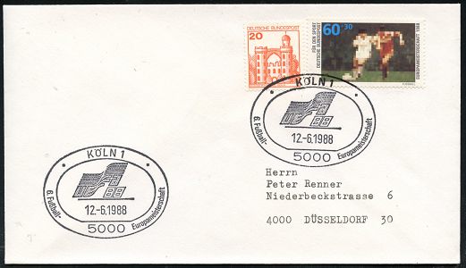 8968 | 5 € | 5000 KÖLN (Sonder- und Handwerbe-Stempel) : 5000 KÖLN 1/ UEFA 88/ 6.Fußball-Europameisterschaft 1988 (12.6.) SSt (Logo) auf 60 + 30 Pf. FB-Europameisterschaft (Mi.1353 u.a.) Inl.-Bf. | ![]() | |