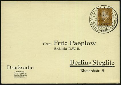 8939 | 18 € | 5000 KÖLN (Sonder- und Handwerbe-Stempel) : KÖLN/ 19.DEUTSCHES BUNDESSCHIESSEN 1930 (22.7.) SSt (3 Gewehrläufe) klar gest .Inl.-Karte (Bo.23) | ![]() | |