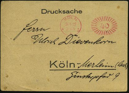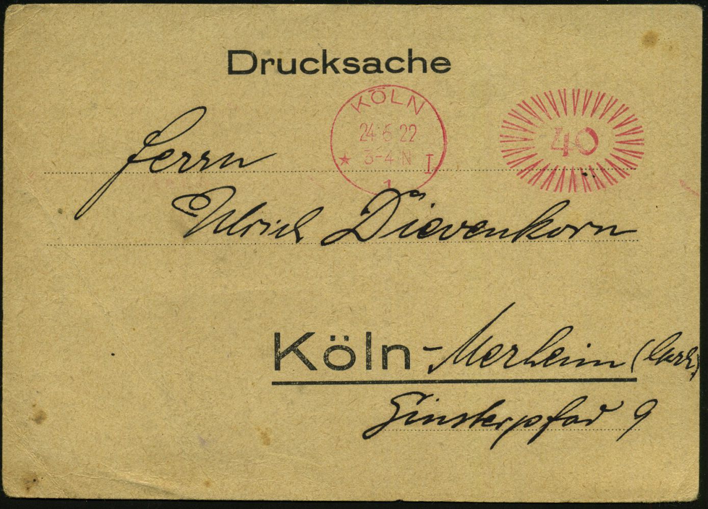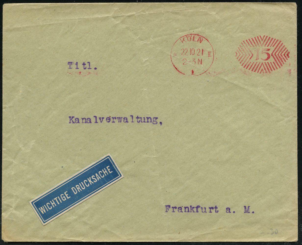 9022 | 16 € | 5000 KÖLN (Post-Freistempel) : KÖLN/ * 1 II 1921 (22.10.) roter Infla-PFS 15 Pf. "Ziermuster" + blauer Aufkleber: WICHTIGE DRUCKSACHE, Inl.-Drs.-Bf. n. Ffm. (Dü.D-1, Nr.8) | ![]() | |