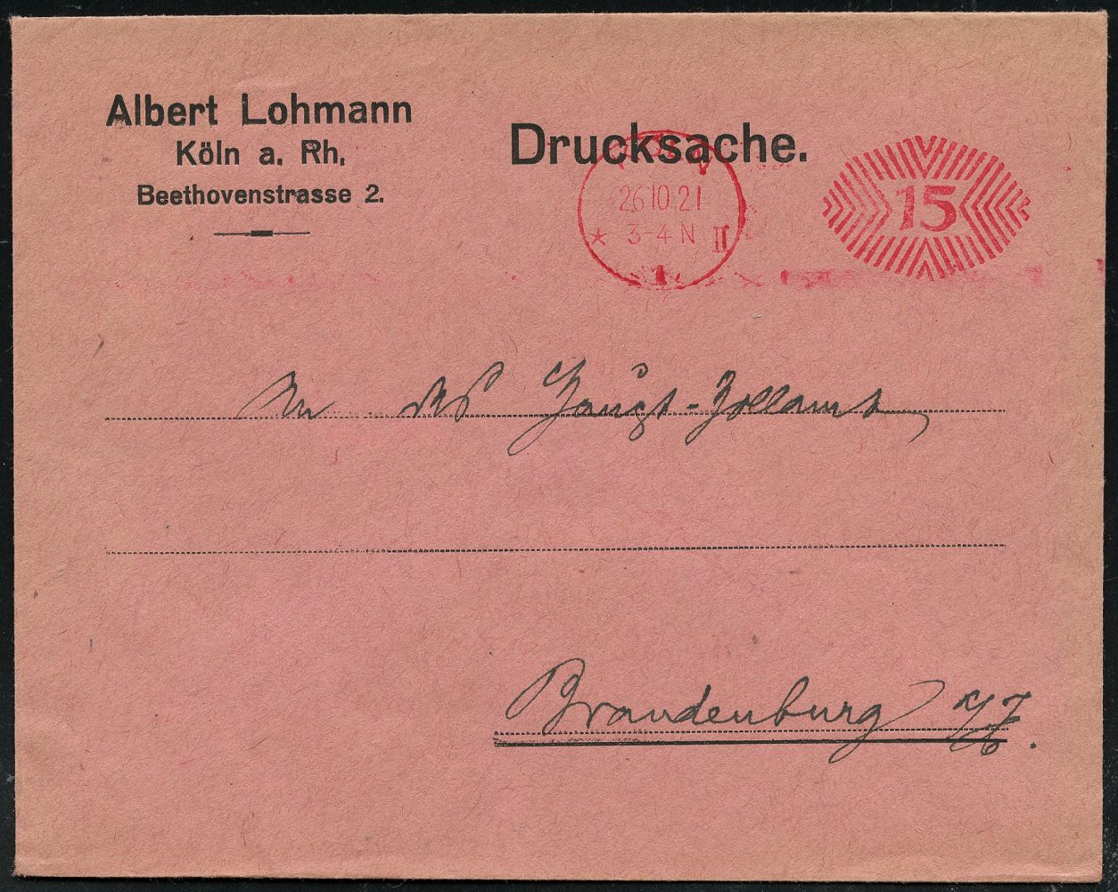 9023 | 18 € | 5000 KÖLN (Post-Freistempel) : KÖLN/ * 1 II 1921 (26.10.) roter Infla-PFS 15 Pf. "Ziermuster", tief stehender Stern u. UZ II (auf Höhe der Uhrzeit) Firmen-Bf.: Albert Lohmann.. (Dü.D-1, Nr.8) | ![]() | |