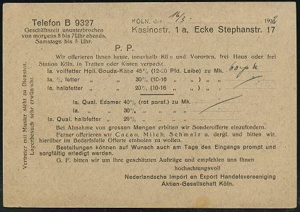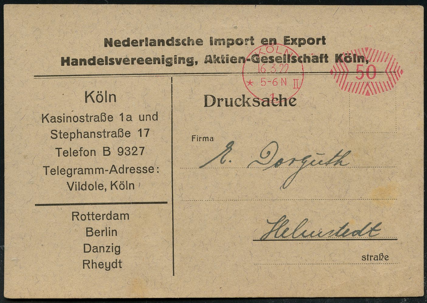 9024 | 18 € | 5000 KÖLN (Post-Freistempel) : KÖLN/ * 1 II 1922 (16.3.) roter Ziermuster.PFS 50 Pf. auf Reklame-Kt.: Nederlandsche Import en Export Handelsvereniging AG.. über Edamer- u. Gouda-Käse, klar gest. Inl.-Karte (Dü.D-1, Nr.11) | ![]() ![]() | |