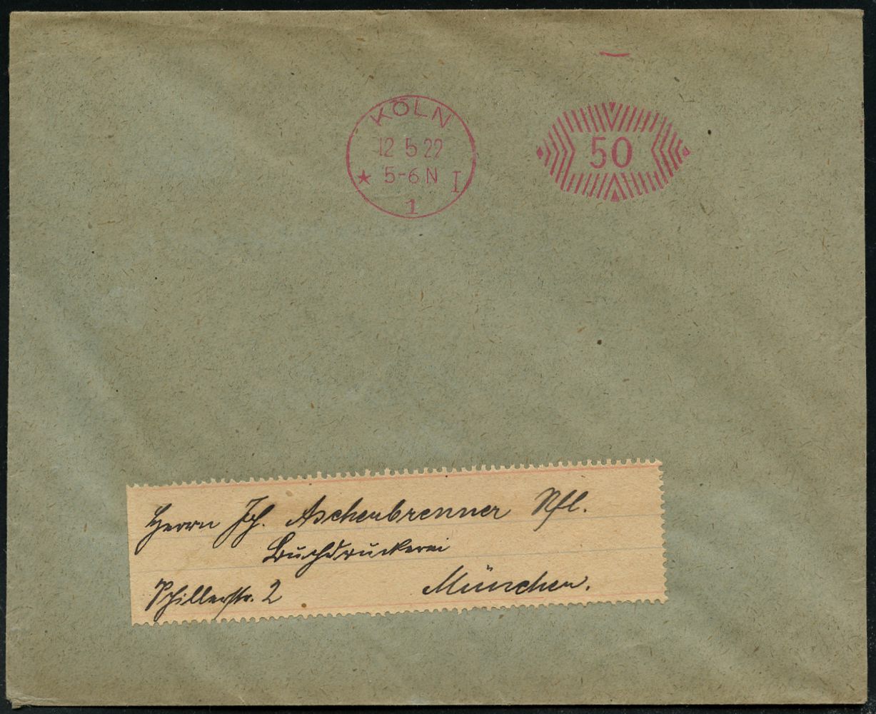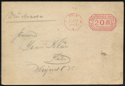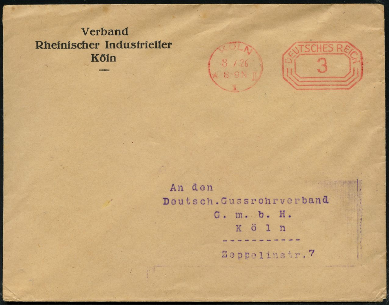 9053 | 6 € | 5000 KÖLN (Post-Freistempel) : KÖLN/ * 1 II/ DEUTSCHES REICH 1926 (8.7.) PFS "Achteck" 3 Pf. (* und UZ "II" tief stehend) Firmen-Bf.: Verband Rheinischer Industrieller Köln (Dü.D-4) | ![]() ![]() | |