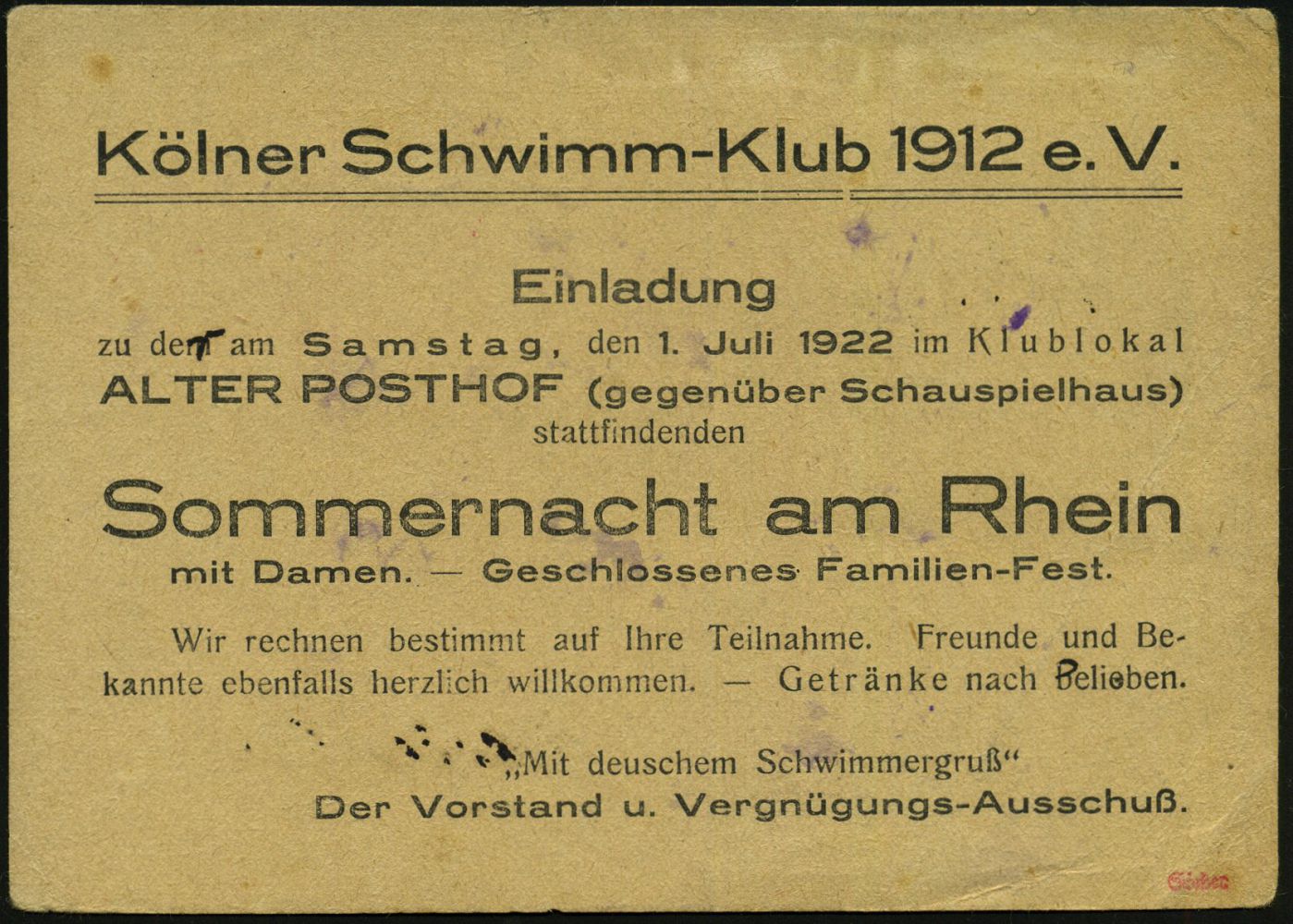 9027 | 16 € | 5000 KÖLN (Post-Freistempel) : KÖLN/ * 1 I 1922 (24.6.) 40 Pf. Ziermuster-PFS 40 Pf. auf Einladungs-Kt.: Kölner Schwimm-Klub 1912 e.V. (Rhein-Sommerfest) Bedarfsspuren, selten! (Dü.10) | ![]() ![]() | |