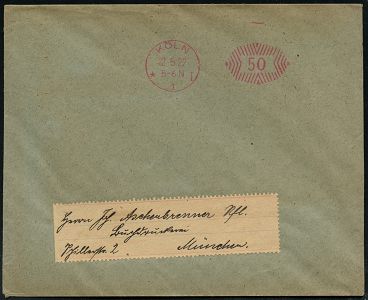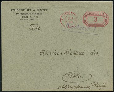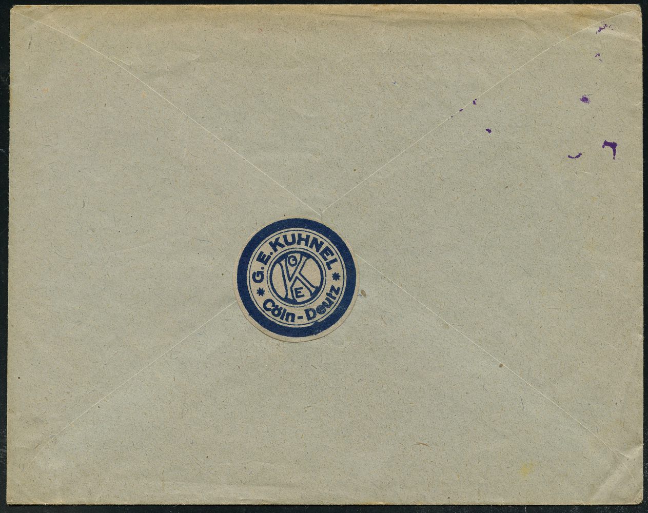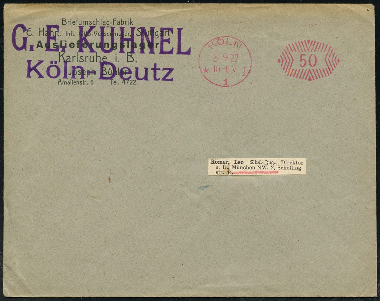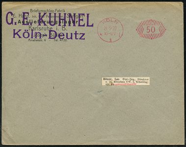 9030 | 16 € | 5000 KÖLN (Post-Freistempel) : KÖLN/ * 1 I 1922 (21.9.) roter Ziermuster-PFS 50 Pf. auf Firmen-Bf.: Briefumschlag-Fabrik E. Hann.. Karlsruhe i. B. überstempelt mit viol. Abs.-2L: G. E. KUHNEL, Köln-Deutz, rs. neue Papiersiegel-Oblate: G. E. KUHNEL n. München (Dü.D-1, Nr.11) | ![]() ![]() | |