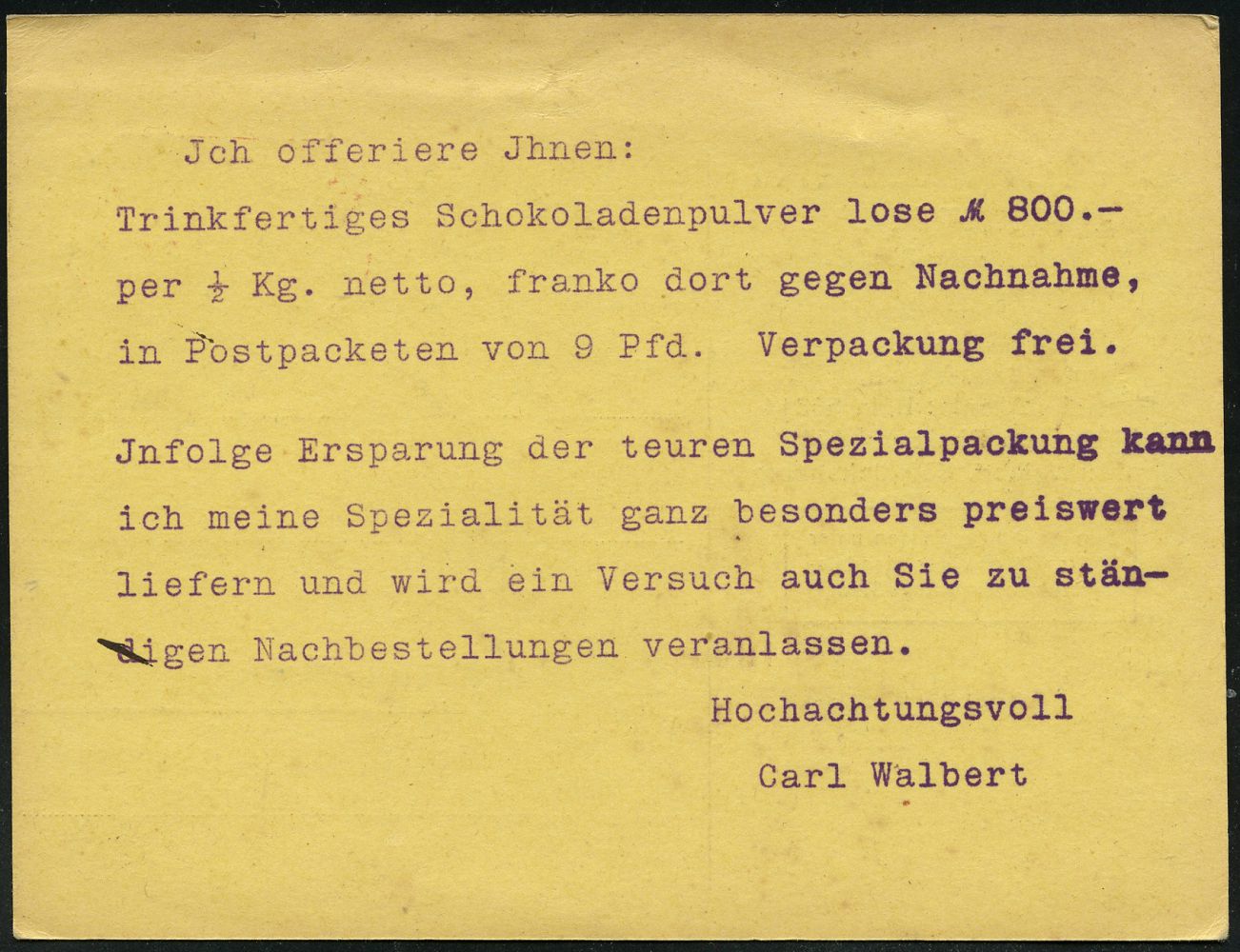 9031 | 15 € | 5000 KÖLN (Post-Freistempel) : KÖLN/ * 1 r/ DEUTSCHES REICH 1923 (9.1.) Infla-PFS "Achteck" 500 Pf auf Reklame-Kt.: CARL WALBERT mit Zulassungsvermerk über Schokoladen-Pulver (Dü.D-3, Nr.36) | ![]() ![]() | |