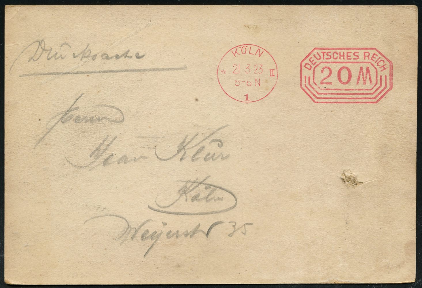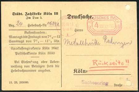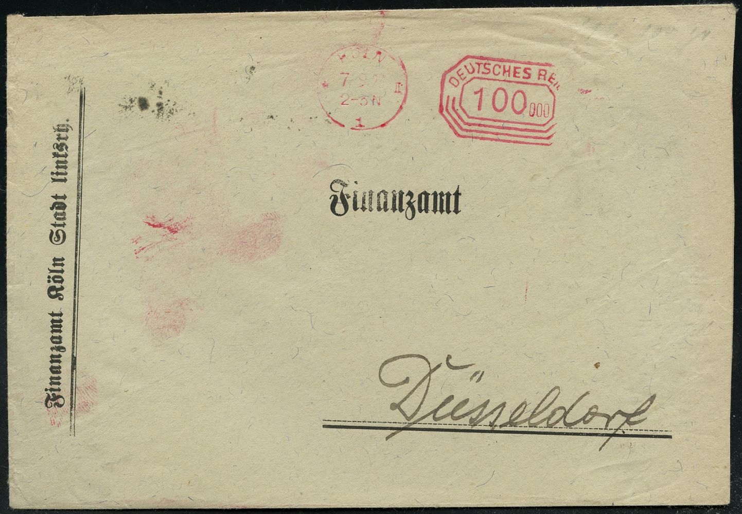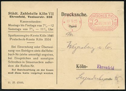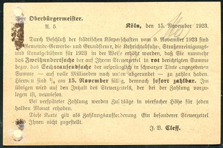 9050 | 40 € | 5000 KÖLN (Post-Freistempel) : KÖLN/ *1II/ DEUTSCHES REICH 1923 (20.11.) Infla-PFS "Achteck" 4ooo ooo ooo (Mark) auf Dienst-Kt.: Städt. Zahlstelle Köln III.. (links Reg.-Lochung geschl.) rs. Text: Der Oberbürgermeister.. über "Zweihundertfache" bzw. "Sechstausendfache" Erhöhung von Steuern u. Gebühren = extreme Hochinflation!, sehr seltene Portostufe, Beleg der Zeitgeschichte! (Dü.D-3, Nr.160) | ![]() ![]() | |