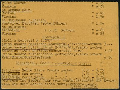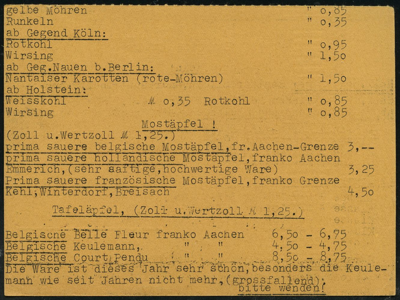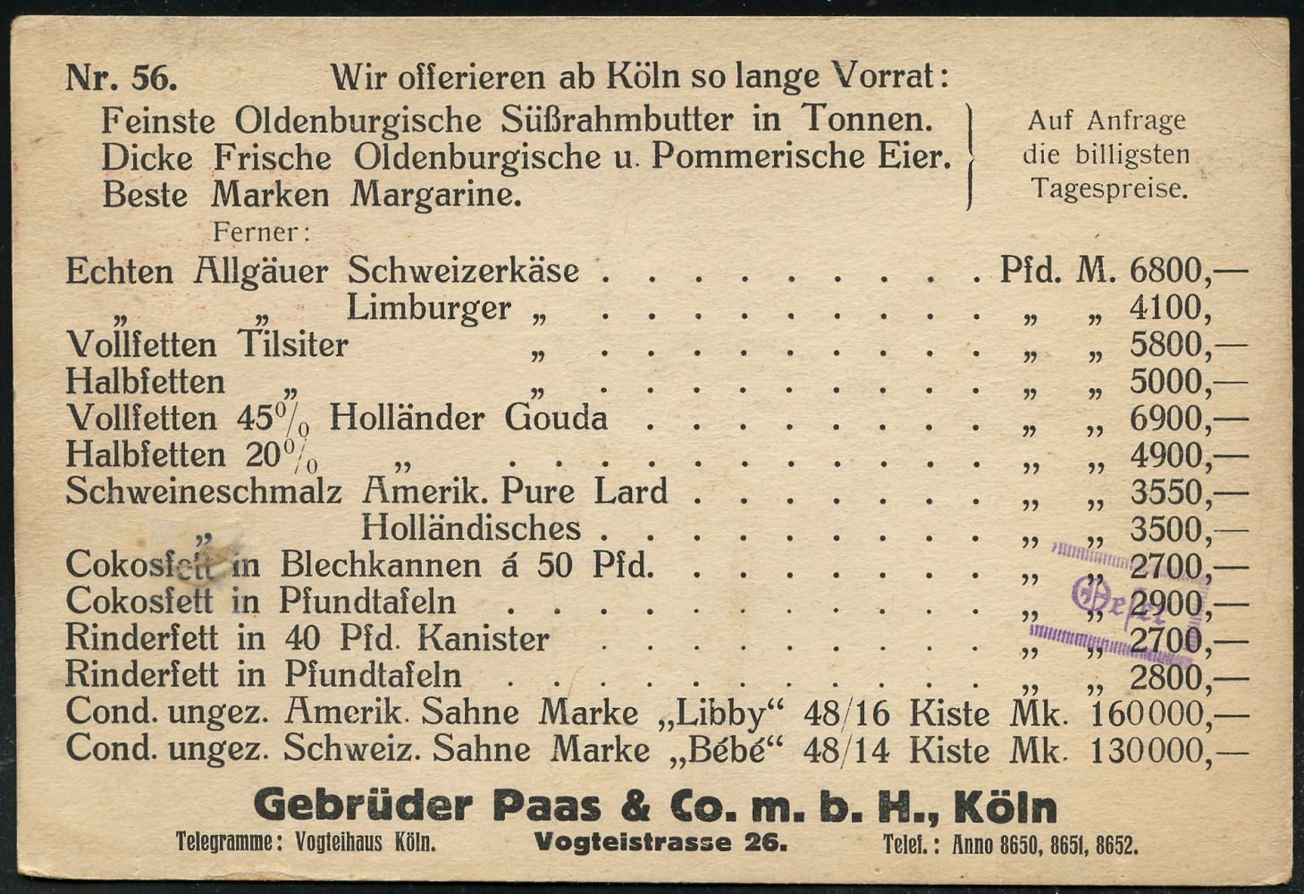 9033 | 15 € | 5000 KÖLN (Post-Freistempel) : KÖLN/ * 1 II/ DEUTSCHES REICH 1923 (21.3.) Infla-PFS "Achteck" 20 M. (ark) auf Reklame-Kt.: Gebr. Paas & Co., Preisliste für Käse, Fett u. US-Produkt "Libby´s" Kondensmilch etc- (Mitte Kerbe geschl.), Orts-Kt. (Dü.D-3, Nr.44) | ![]() ![]() | |