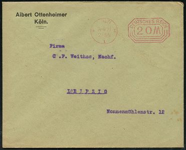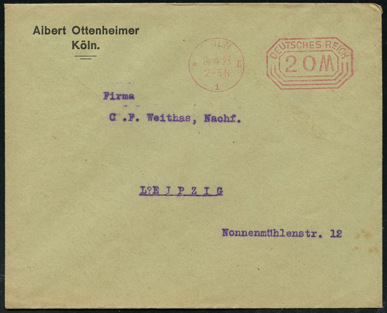9035 | 10 € | 5000 KÖLN (Post-Freistempel) : KÖLN/ *1II/ DEUTSCHES REICH 1923 (24.4.) Infla-PFS "Achteck" 20 M (ark) auf Firmen-Bf.: Albert Ottenheimer (Dü.D-3, Nr.44) | ![]() | |