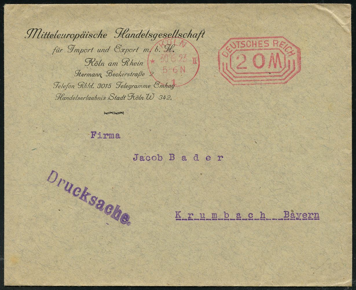 9036 | 12 € | 5000 KÖLN (Post-Freistempel) : KÖLN/ *1II/ DEUTSCHES REICH 1923 (30.6.) Infla-PFS "Achteck" 20 M (ark) auf Firmen-Bf.: Mitteleuropäische Handelsgesellschaft für Jmport u. Export m.b.H.. (Dü.D-3, Nr.44) | ![]() | |