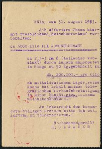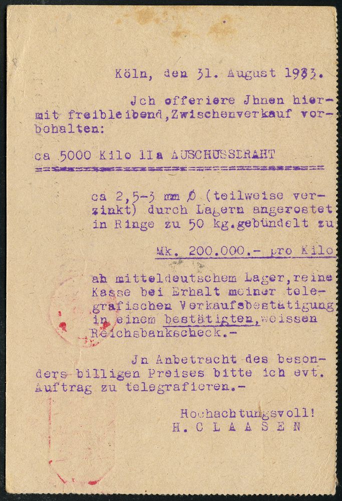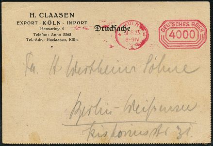 9042 | 14 € | 5000 KÖLN (Post-Freistempel) : KÖLN/ *1II/ DEUTSCHES REICH 1923 (31.8.) Infla-PFS "Achteck" 4000 (Mark) auf (halber) Reklame-Kt.: H. CLAASEN.. über Angebot von 5000kg Ausschussdraht n. Berlin (Dü.D-3, Nr.83) | ![]() ![]() | |