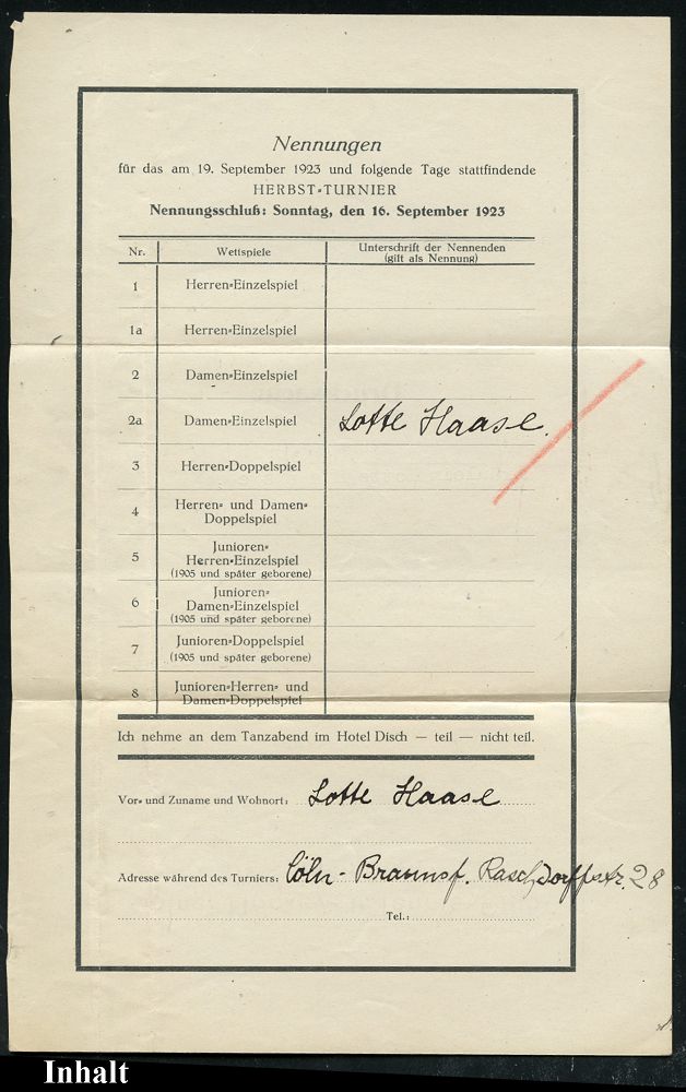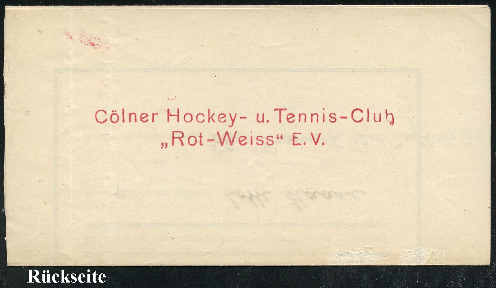 9043 | 18 € | 5000 KÖLN (Post-Freistempel) : KÖLN/ *1II/ DEUTSCHES REICH 1923 (13.9.) Infla-PFS 15ooo (Mark) + rs. roter Abs.-2L: Cölner Hockey- u. Tennis-Club/ "Rot-Weiss" E. V. auf Felt-Bf. mit Inhalt zum Tennis-Herbst-Turnier zum Damen-Einzel (Frau Lotte Haase), Orts-Bf. (Dü.D-3, Nr. 88) | ![]() ![]() ![]() | |