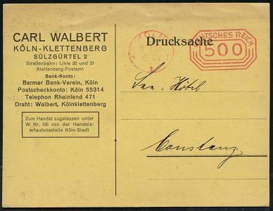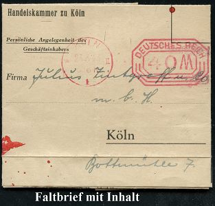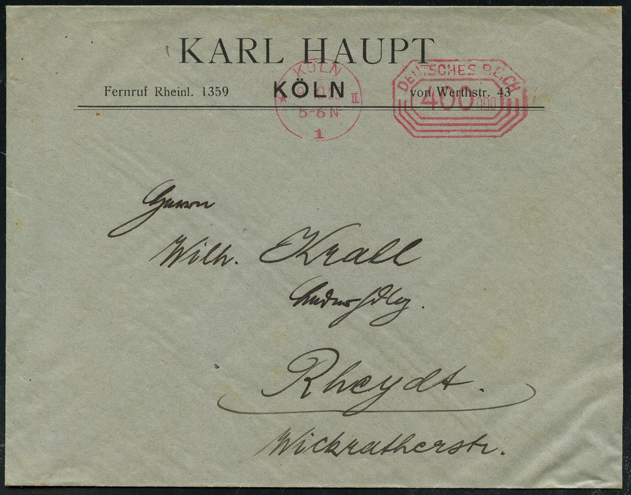 9044 | 16 € | 5000 KÖLN (Post-Freistempel) : KÖLN/ *1II/ DEUTSCHES REICH 1923 (9.10.) Infla-PFS 400ooo (Mark) auf Firmen-Bf.: KARL HAUPT.. n. Rheydt = Porto Letzttag ! (Dü.D-3, Nr.119) | ![]() | |