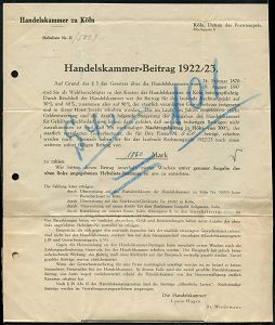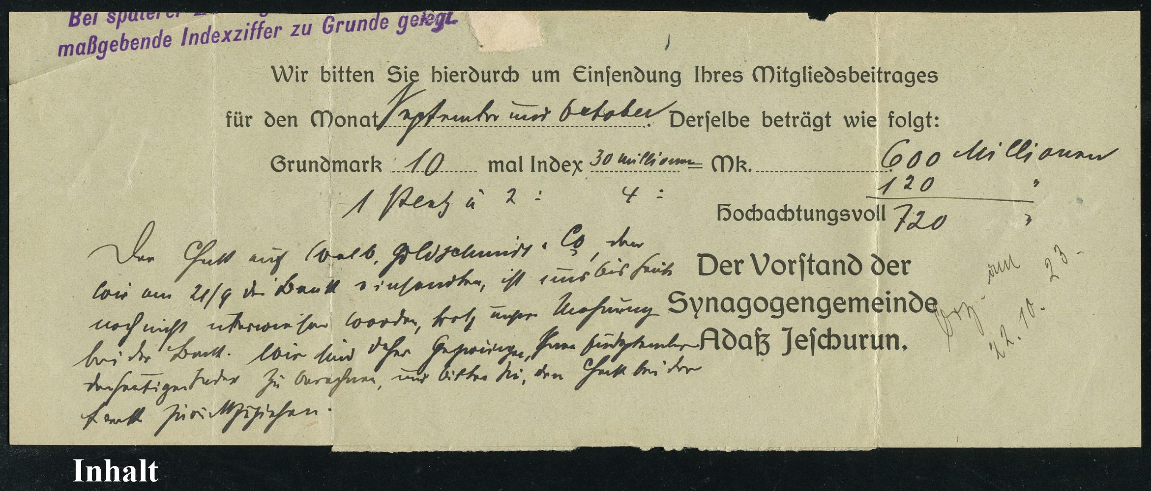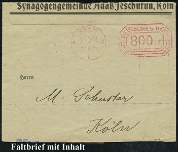 9045 | 35 € | 5000 KÖLN (Post-Freistempel) : KÖLN/ *1II/ DEUTSCHES REICH 1923 (9.10.) Infla-PFS 800ooo (Mark) auf Falt-Bf.: Synagogengemeinde Adaß Jeschurum mit Inhalt (etw. knapp geöffnet) Vordruck zum Mitgliedsbeitrag über 720 Millionen Mark + hs. Ergänzungstext !, interessanter Belege vom Porto-Ltzttag! (Dü.D-3, Nr. 121) | ![]() ![]() | |