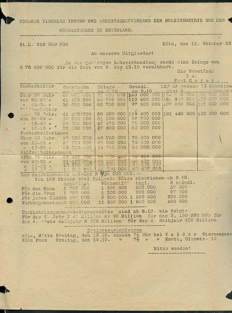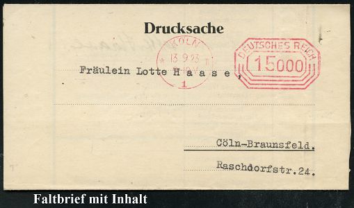 9046 | 30 € | 5000 KÖLN (Post-Freistempel) : KÖLN/ ´1II/ DEUTSCHES REICH 1923 (31.10.) Infla-PFS "Achteck" 100ooo (Mark) mit drei verschiedenen Nullen auf Falt-Bf. der Tischler-Innung u. Arbeitgeberverband Holzindustrie.. mit Inhalt: Lohnverhandlungen Oktober, z. B. Facharbeiterin Grundlohn 29.250.00.- RM + Zulage 48.750.000.- Mk etc. (innen gelocht, 2 x kl. Ausriß), seltene Portostufe!, interess. Zeit-Dokument der Hoch-Inflation! (Dü.D-3, Nr.122) | ![]() ![]() | |
