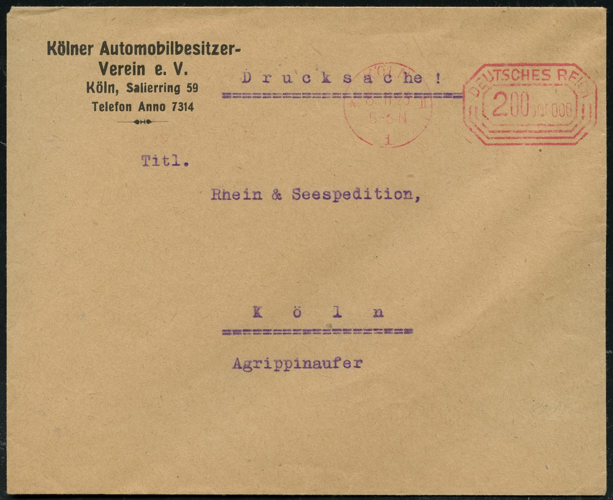 9048 | 25 € | 5000 KÖLN (Post-Freistempel) : KÖLN/ *1II/ DEUTSCHES REICH 1923 (8.11.) Infla-PFS 200 ooo ooo (Mark) auf Vordruck-Bf.: Kölner Automobilbesitzer-Verein e.V., Orts-Bf., seltene Portostufe! (Dü.D-3, Nr.151) | ![]() | |