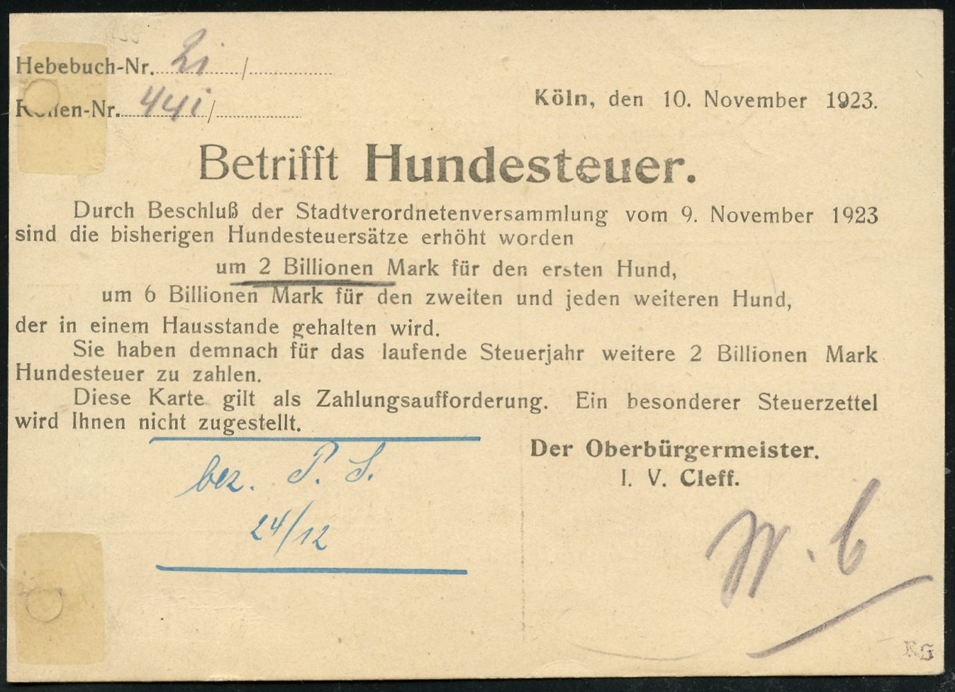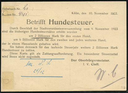 9049 | 35 € | 5000 KÖLN (Post-Freistempel) : KÖLN/ *1II/ DEUTSCHES REICH 1923 (19.11.) Infla-PFS "Achteck" 2oo ooo ooo (Mark) auf Dienst-Kt.: Städt Zahlstelle Köln.. über Hundesteuer, rs. Text "..die bisherige Hundesteuer erhöht worden um 2 Billionen Mark für den ersten Hund.." (rechts Reg.-Lochung geschl.) sehr seltene Portostuge!, seltener Beleg der Zeit- u. Fiskal-Geschichte! (Dü.D-3, Nr.159) | ![]() ![]() | |