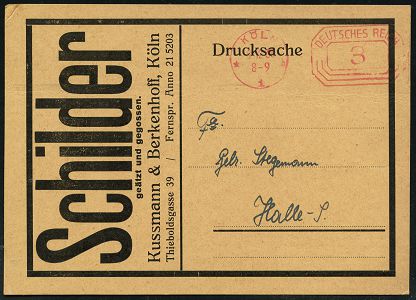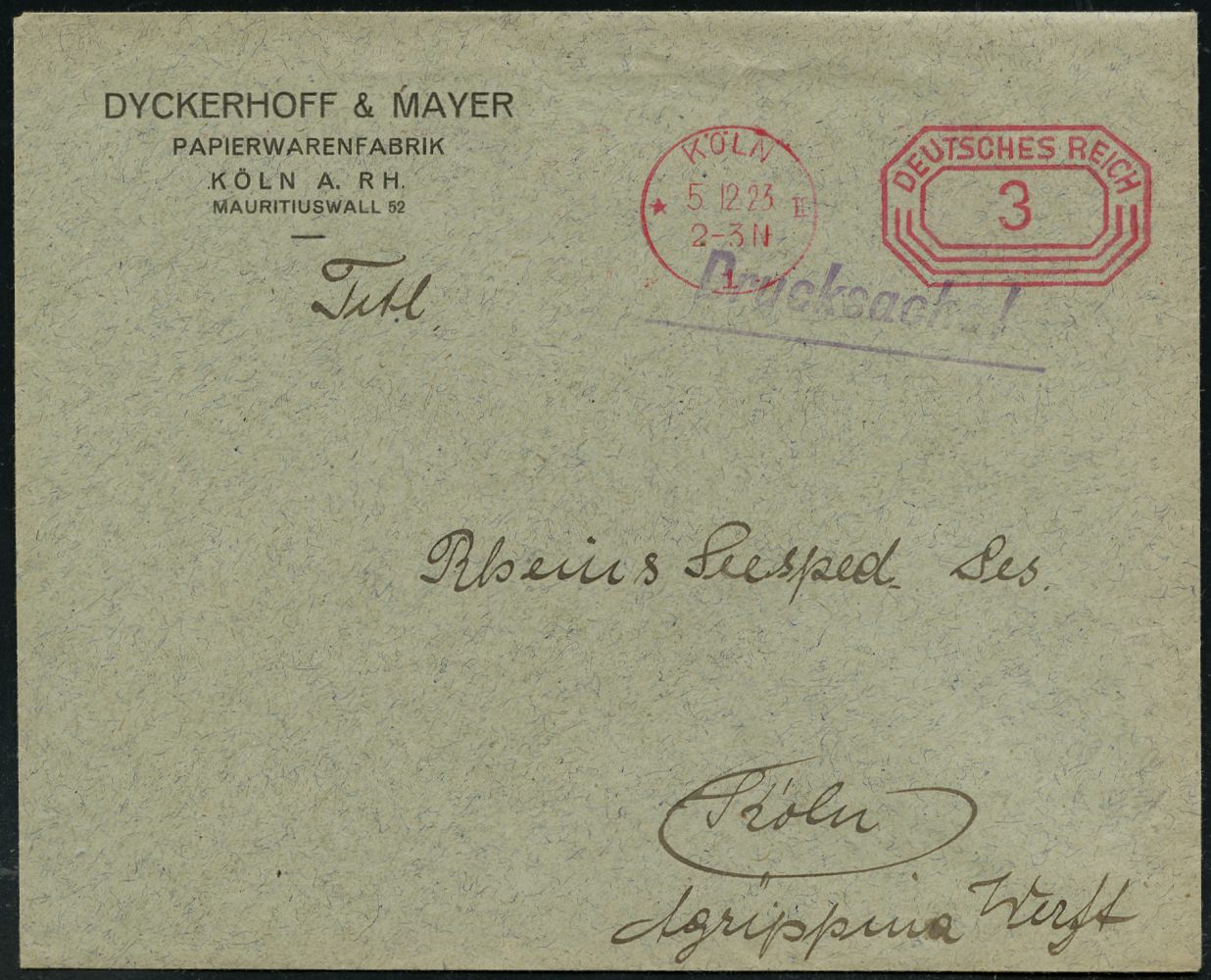 9052 | 25 € | 5000 KÖLN (Post-Freistempel) : KÖLN/ *1II/ DEUTSCHES REICH 1923 (5.12.) PFS "Achteck" 3 Pf. = Währungsreform im Dezember = 1 Milliarde = 1 Pf. auf Firmen-Bf.: DYCKERHOFF & MAYER, PAPIERWARENFABRIK.., Orts-Bf. (Dü.D-4 = Dezember-Beleg !) | ![]() ![]() | |