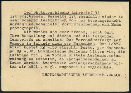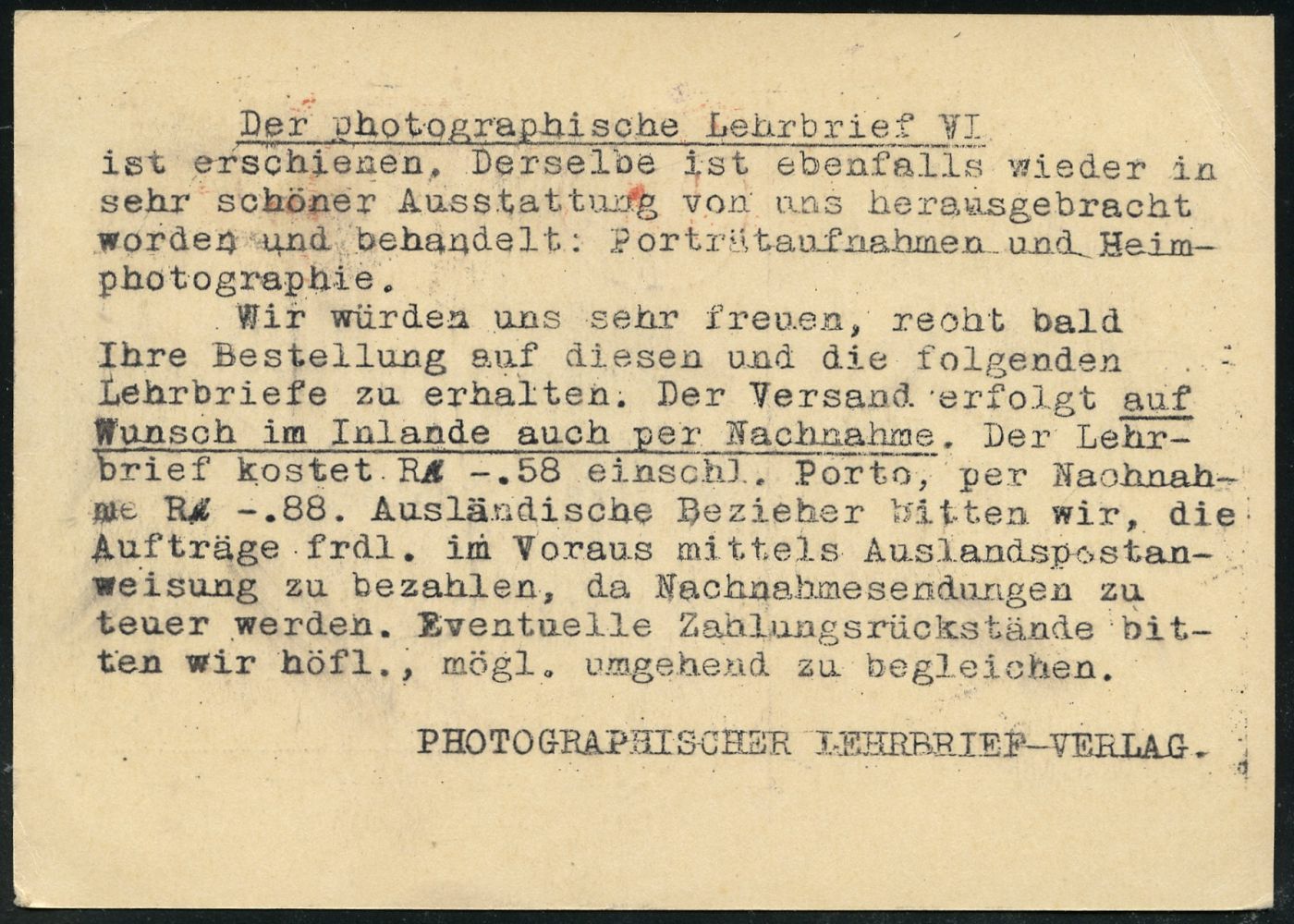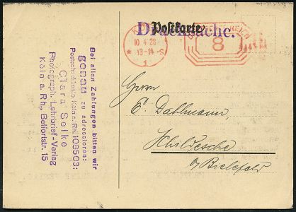 9054 | 15 € | 5000 KÖLN (Post-Freistempel) : KÖLN/ * 1 S/ DEUTSCHES REICH 1928 (10.4.) PFS "Achteck" 8 Pf. + viol. Abs.-6L: ..Clara Selke/ Photograph. Lehrbrief-Verlag , rs. Text zu, photographischen Lehrbrief VI, Drs.-Karte irrtümlich als Postkarte frankiert! (Dü.D-4) | ![]() ![]() ![]() | |
