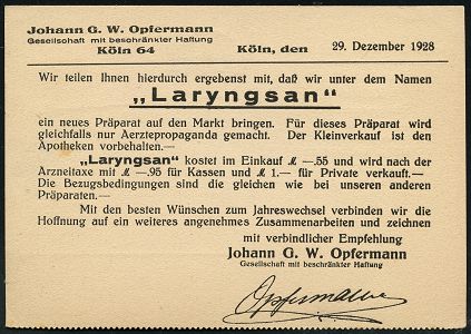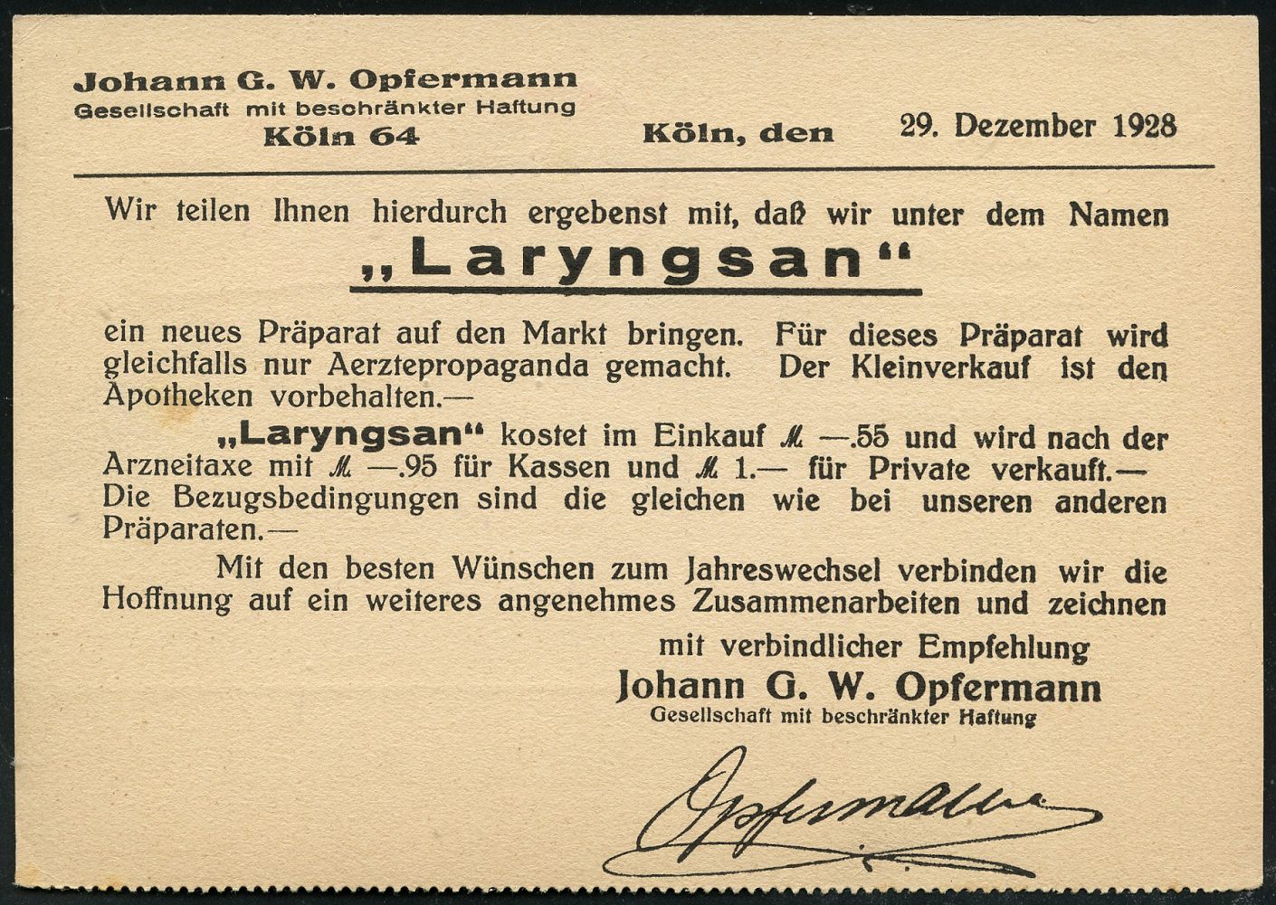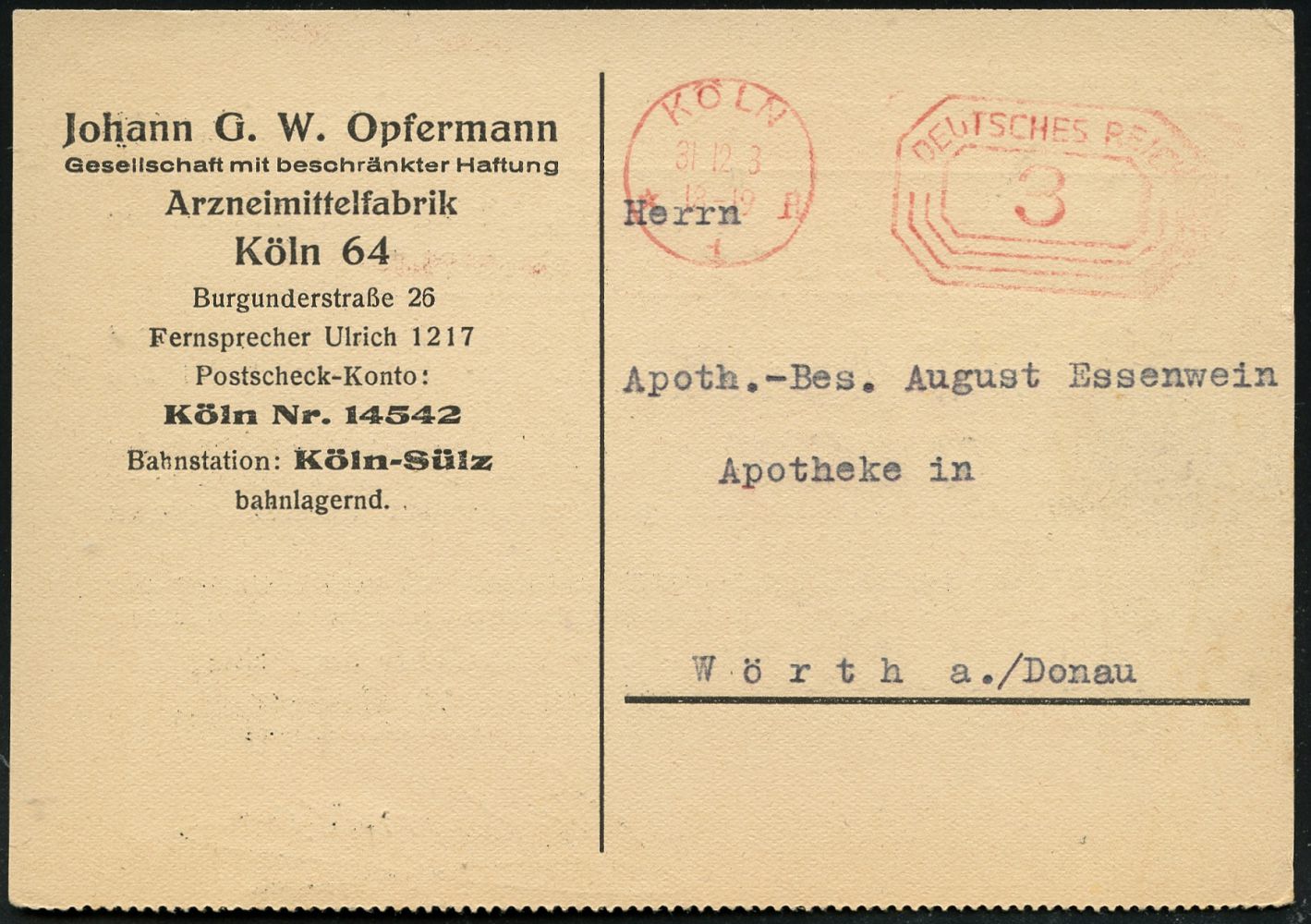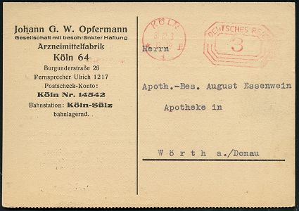 9056 | 14 € | 5000 KÖLN (Post-Freistempel) : KÖLN/ *1A/ DEUTSCHES REICH 1928 (31.12.) PFS "Achteck" 3 Pf. mit UB "A" auf (halber) Reklame-Kt.: Johann G. W. Opfermann.. Arzneimittelfabrik für Medikament "Laryngsan" (Dü.D-4) | ![]() ![]() ![]() | |