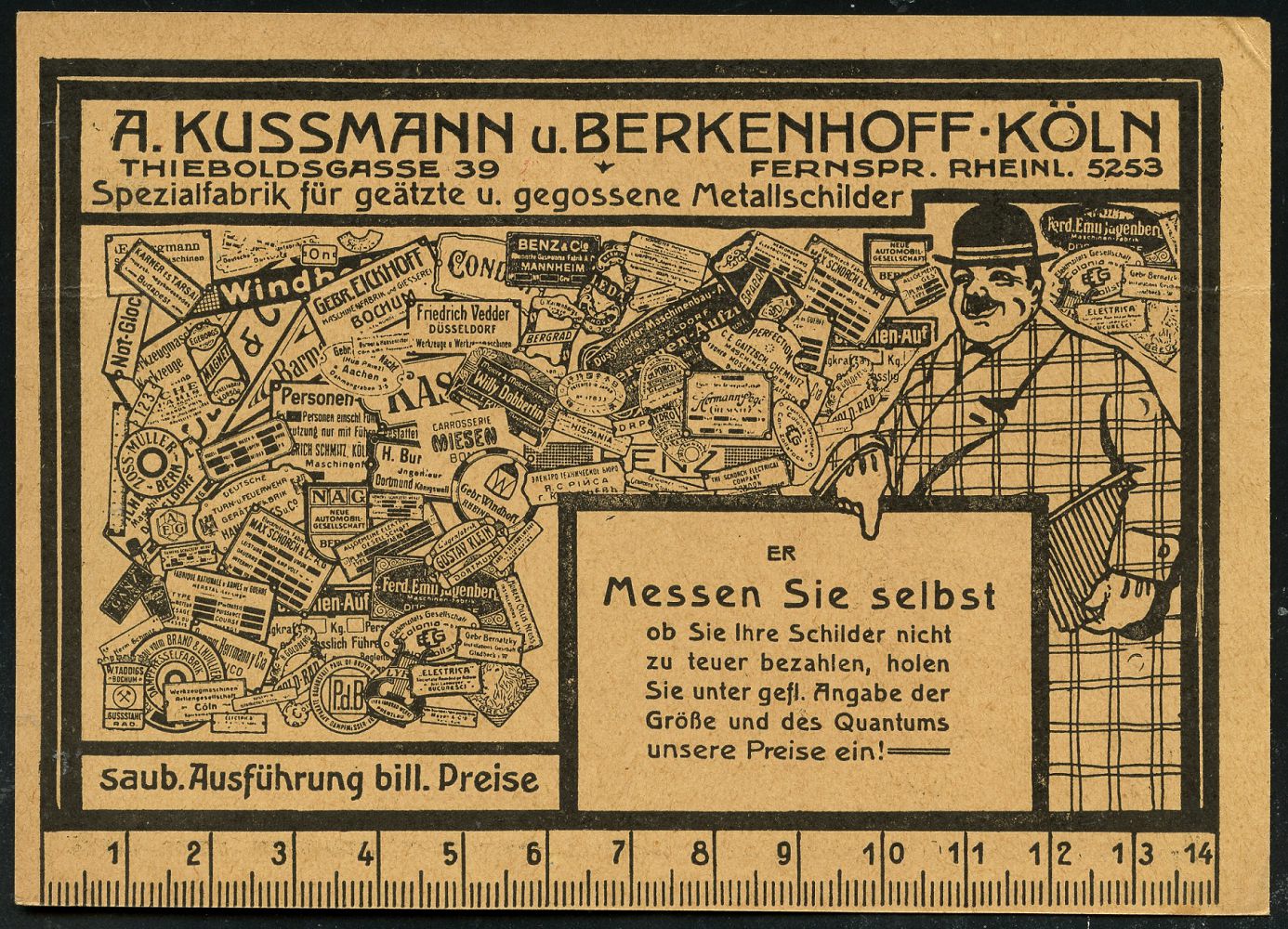 9057 | 18 € | 5000 KÖLN (Post-Freistempel) : KÖLN/ *1b/ DEUTSCHES REICH 1930 (9.12.) PFS "Achteck" 3 Pf. auf dekorativer Reklame-Kt.: A. KUSSMANN u. BERKENHOFF.. Spezialfabrik für geäzte u. gegossene Metallschilder = Vertreter mit zahllosen Schilder-Beispielen und Zentimeter-Maßstab am Rand n. Halle/S. (Dü.D-4) | ![]() ![]() ![]() | |