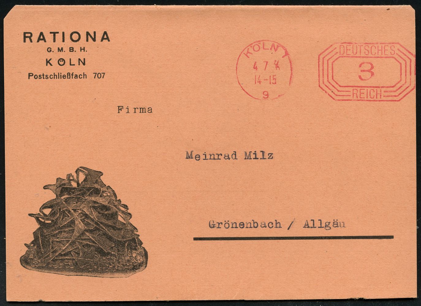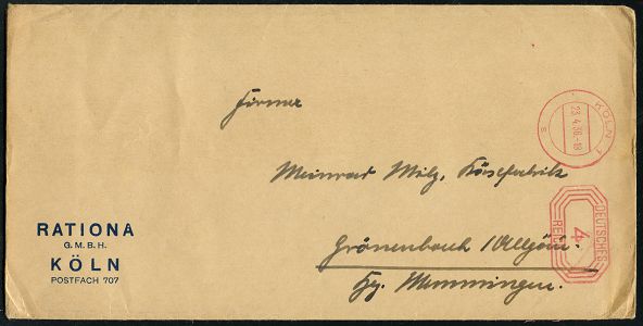 9066 | 6 € | 5000 KÖLN (Post-Freistempel) : KÖLN 1/ s/ DEUTSCHES/ REICH 1936 (23,4,) PFS "Achteck" 4 Pf. auf Firmen-Bf.: RATIONA GMBH.. (Dü.D-5) | ![]() ![]() | |