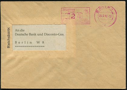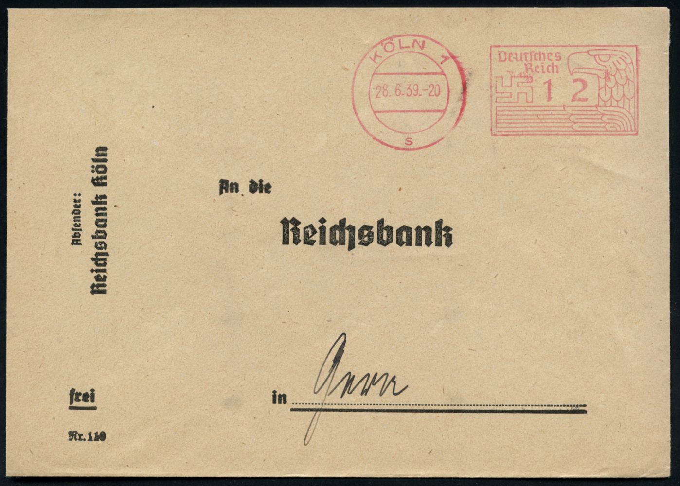 9069 | 15 € | 5000 KÖLN (Post-Freistempel) : KÖLN 1/ s/ Deutsches/ Reich 1939 (28.6.) PFS "Hakenkreuz/Adler" 12 Pf. = Briefporto! , Dienstbf.: Reichsbank Köln n. Gera (Dü.D-6) | ![]() | |