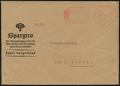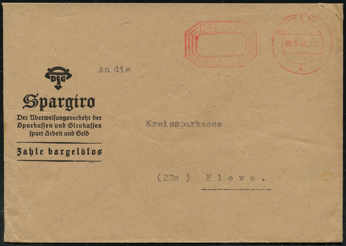 9073 | 20 € | 5000 KÖLN (Post-Freistempel) : (22) KÖLN 1/ e/ GEBÜHR/ BEZAHLT 1946 (9.5.) Maschinen-PFS, Sonderform "Achteck" ohne Wertangabe in r o t a.uf dekorativem Sparkassen-Bf. (kl. Randrißchen) = Fernbf.-Porto! (Dü.245 (rot), nur in Köln verwendet) | ![]() | |