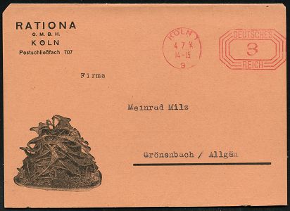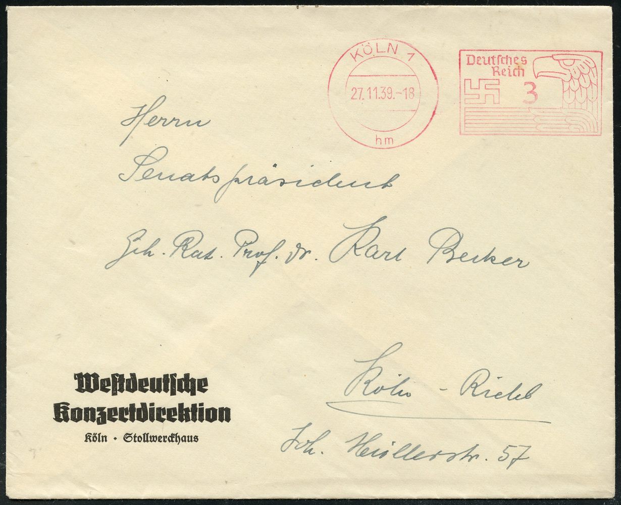 9070 | 18 € | 5000 KÖLN (Post-Freistempel) : KÖLN 1/ hm/ Deutsches/ Reich 1939 (27.11.) PFS "Hakenkreuz/Adler" 3 Pf. auf Vordruck-Bf.: Westdeutsche Konzertdirektion.. Stollwerckhaus an Senatspräsident Prof. Dr. Karl Becker (Dü.D-6) | ![]() | |
