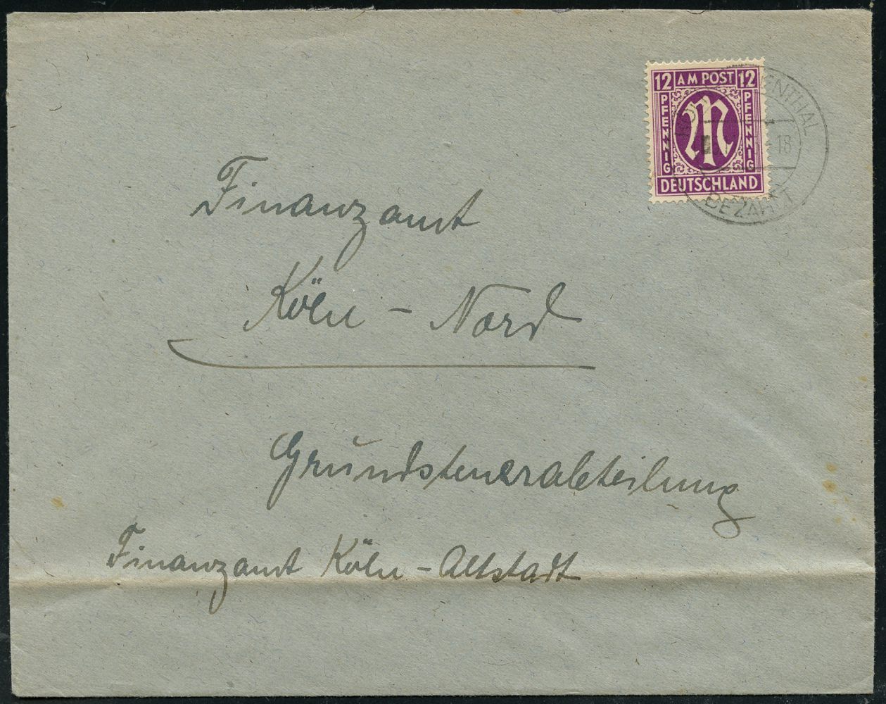 9072 | 18 € | 5000 KÖLN (Post-Freistempel) : KÖLN-BAYENTHAL/ BEZAHLT 1945 (5.11.) schwarzer 2K-Steg-Postfreostempel als Entwertung auf AM-Post 12 Pf. EF (Bf. unten Querfalte) klar gest. Orts-Bf. an Finanzamt (Dü.A 7, Nr.32 in schwarz) | ![]() | |