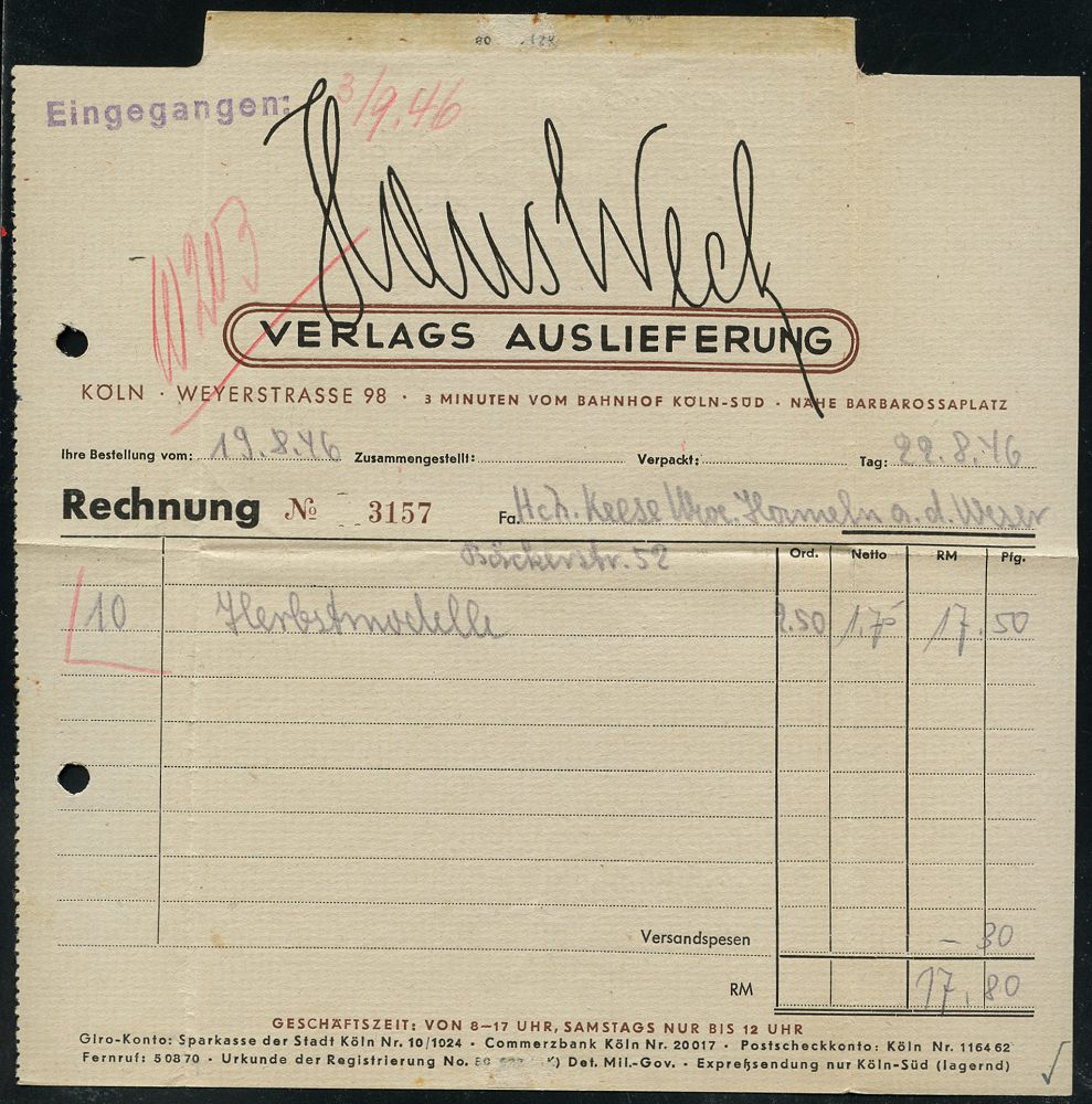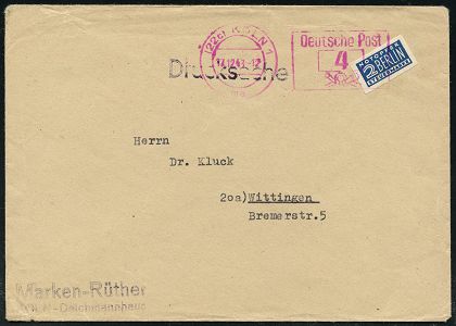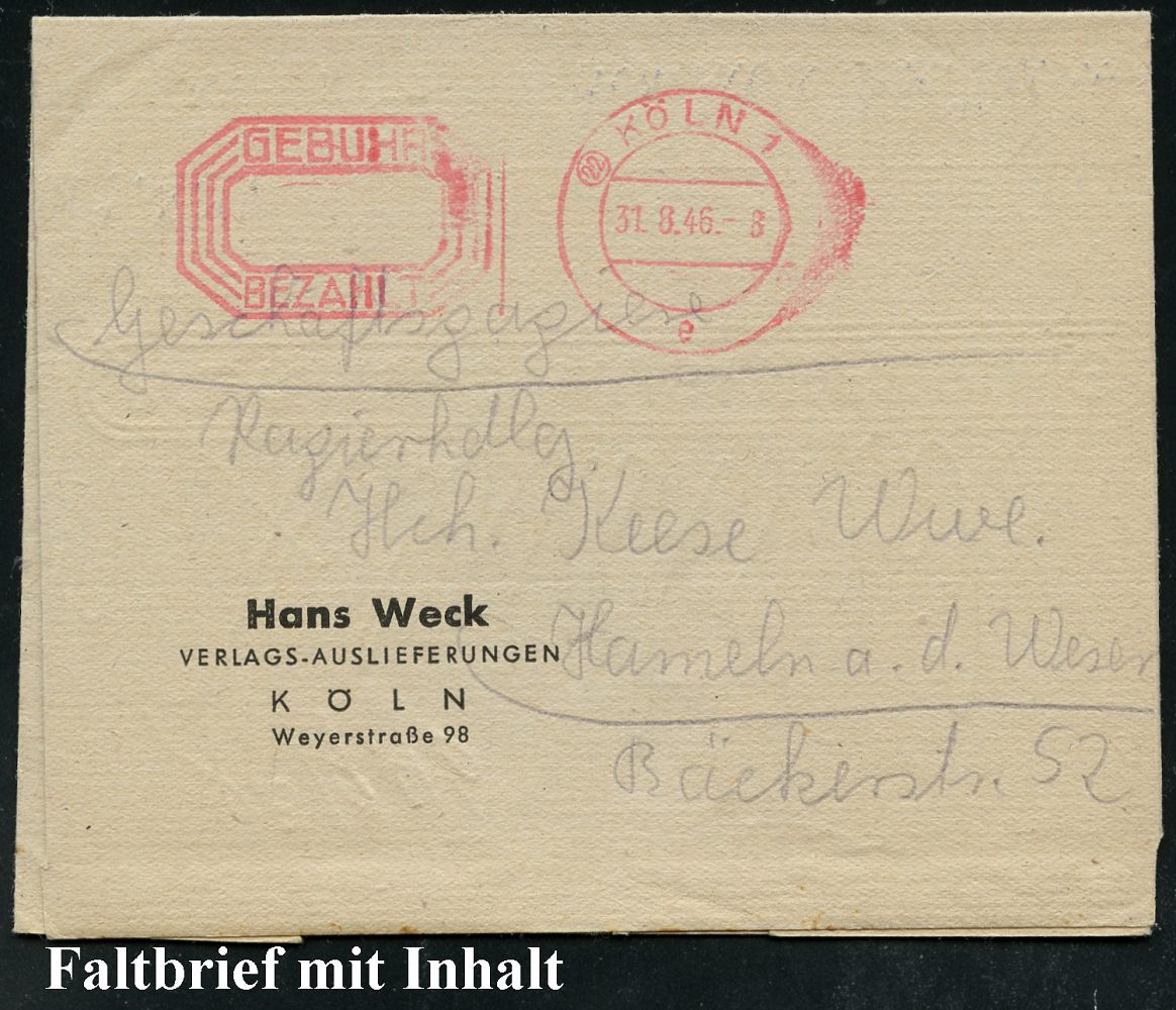 9074 | 18 € | 5000 KÖLN (Post-Freistempel) : (22) KÖLN 1/ e/ GEBÜHR/ BEZAHLT 1946 (31.8.) Maschinen-PFS, Sonderform "Achteck" ohne Wertangabe in rotviolett auf Firmen-Falt-Bf.: Hans Weck, VERLAGS-AUSLIEFERUNGEN (innen 1x gelocht) n. Hameln (Dü.Nr.245 (rotviolett) nur in Köln verwendet) | ![]() ![]() | |