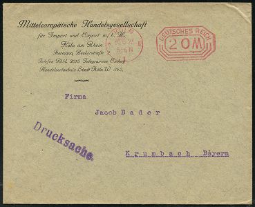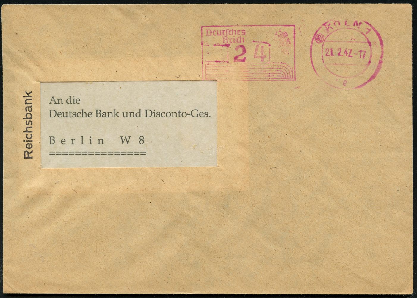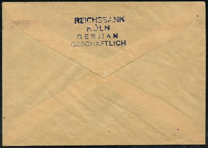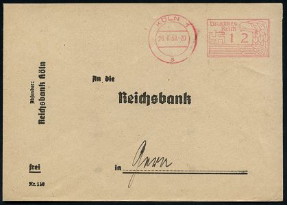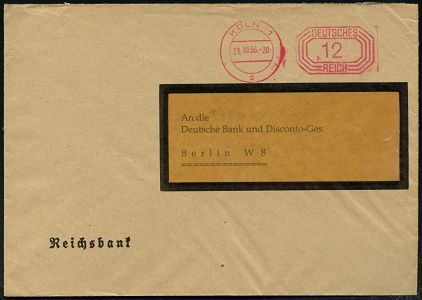 9067 | 8 € | 5000 KÖLN (Post-Freistempel) : KÖLN 1/ s/ DEUTSCHES/ REICH 1936 (21.10.) PFS "Achteck" zweizeilig, 12 Pf. , Dienst-Fern-Bf.: Reichsabnk (Dü.D-5 = Briefporto!) | ![]() ![]() | |