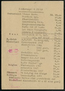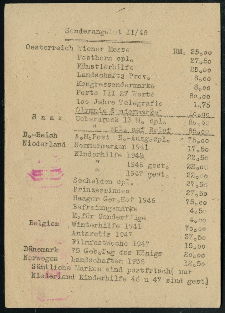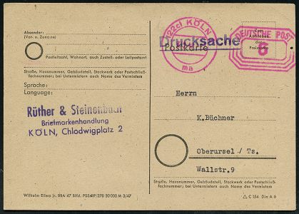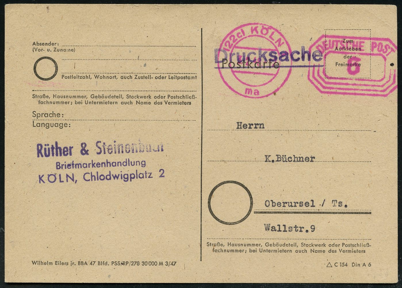 9079 | 12 € | 5000 KÖLN (Post-Freistempel) : (22c) KÖLN 1/ ma/ DEUTSCHE POST 1948 (3.2.) lilaroter PFS "Achteck" mit UB "ma", 6 Pf. auf Firmen-Drs.-Kt.: Rüther & Steinenbach, Briefmarkenhandlung.., rs. Preisliste für Österreich-, Niederlande- u. Belgien-Ausgaben etc. (Dü.D-11, Nr.260) | ![]() ![]() | |
