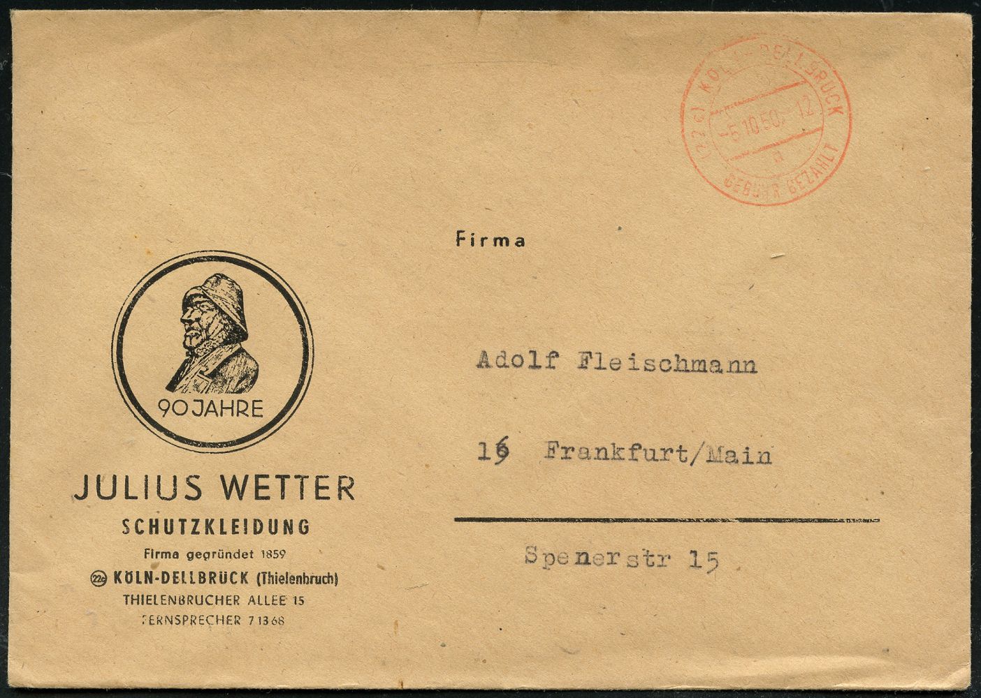9083 | 16 € | 5000 KÖLN (Post-Freistempel) : (22c) KÖLN-DELLBRÜCK/ a/ GEBÜHR BEZAHLT 1950 (5.10.) Hand-2Kreis-Steg-PFS auf Jubiläums-Firmen-Bf.: 90 JAHRE, JULIUS WETTER, SCHUTZKLEIDUNG.. (Seemann mit Schutzhut), vergl. Nr. 9068 (Dü.A 7, Nr.32) | ![]() | |