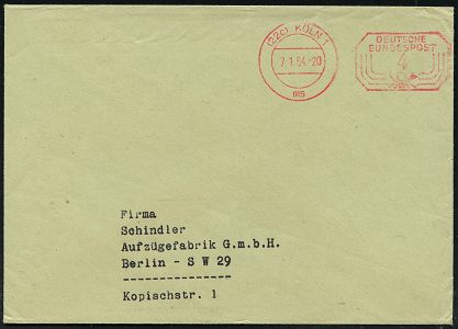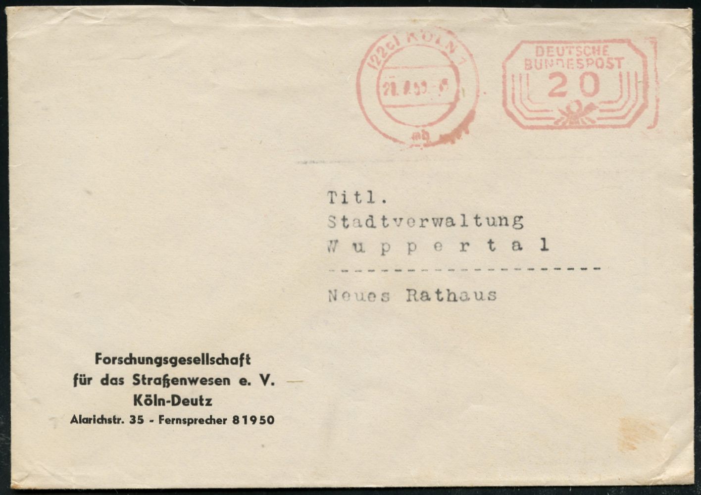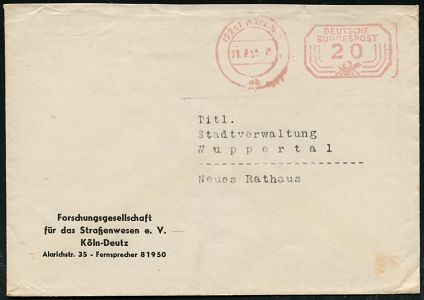 9084 | 14 € | 5000 KÖLN (Post-Freistempel) : (22c) KÖLN 1/ mb/ DEUTSCHE/ BUNDESPOST 1950 (28.4.) PFS "Achteck" , UB "mb" mit Posthorn, 20 Pf. = Briefporto! , Vordruck-Bf.: Forschungsgesellschaft für das Straßenwesen.. Köln-Deutz (Dü.D-16, Nr.272 = 4 Blitze am Posthorn) | ![]() | |