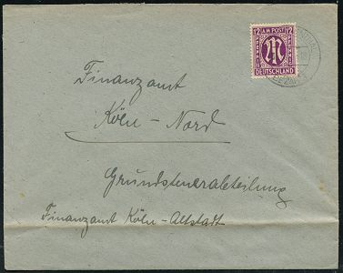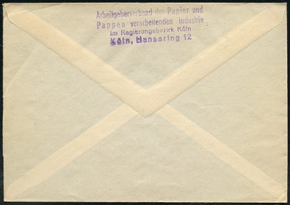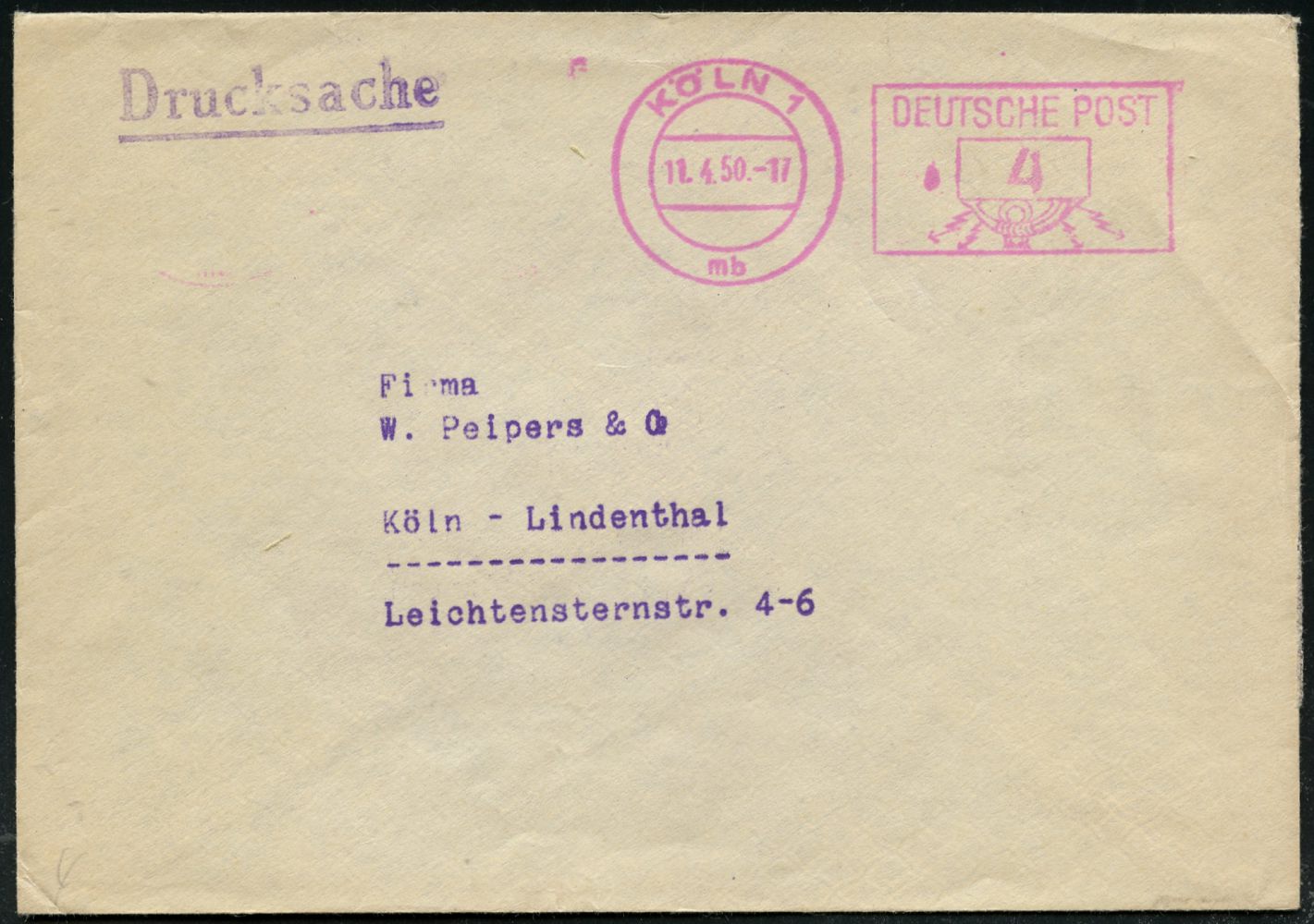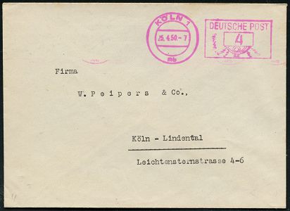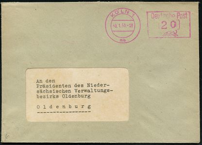 9086 | 8 € | 5000 KÖLN (Post-Freistempel) : KÖLN 1/ mb/ DEUTSCHE POST 1950 (11.4.) viol. PFS "Querrecteck" UB "mb" mit Posthornm 4 Pf., rs. viol. Abs.-4L: Arbeitgeberverband Papier u. Pappen.., Orts-Bf. (Dü.D-15, Nr. 269, violett) | ![]() ![]() | |