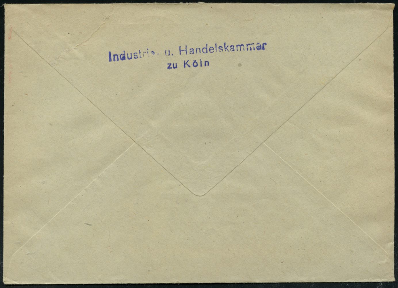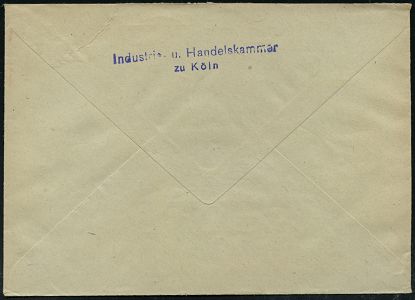 9087 | 10 € | 5000 KÖLN (Post-Freistempel) : KÖLN 1/ mb/ Deutsche Post 1950 (30.1.) violetter PFS "Querrechteck" UB "mb" mit Posthorn, 20 Pf. = Briefporto, rs, Abs.-2L: Industrie u. Handelskammer/ zu Köln (Dü.D-14, Nr.267, violett) | ![]() ![]() | |