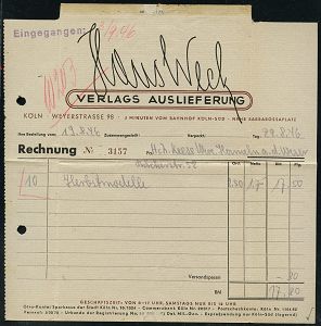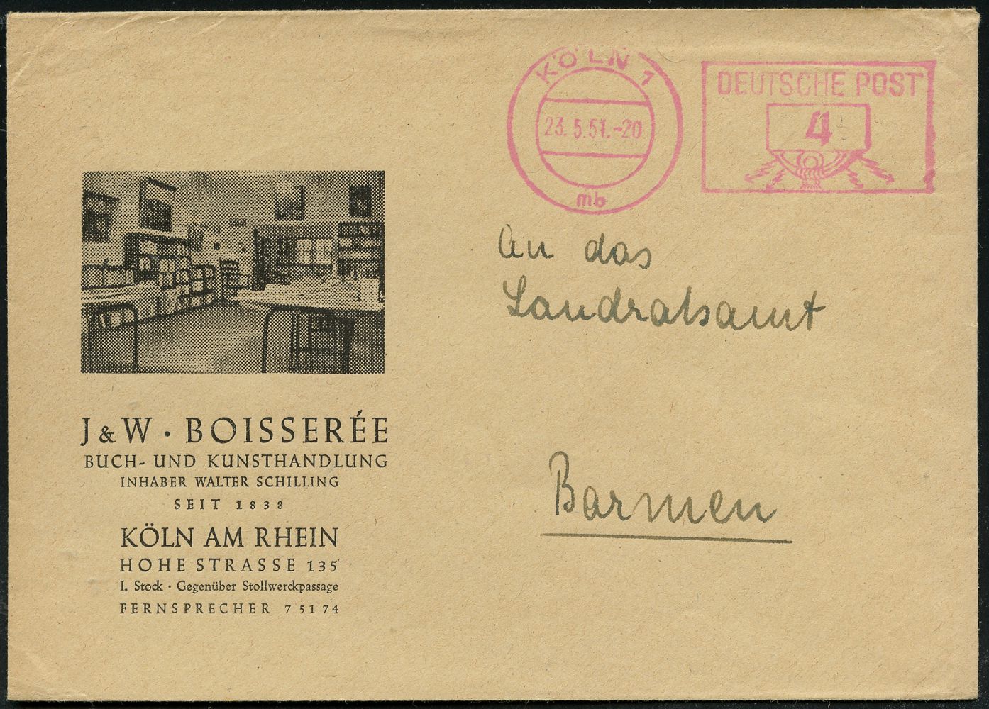 9088 | 10 € | 5000 KÖLN (Post-Freistempel) : KÖLN 1/ mb/ DEUTSCHE POST 1951 (23.5.) PFS "Querrechteck", UB "mb" mit Posthorn, 4 Pf., auf Reklame-Bf.: J & W. BOISSEREÈE, Buch- u. Kunsthandlung.. (Innenraum) Inl.-Drs.-Bf. (Dü.D-15, Nr.269) | ![]() | |
