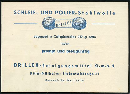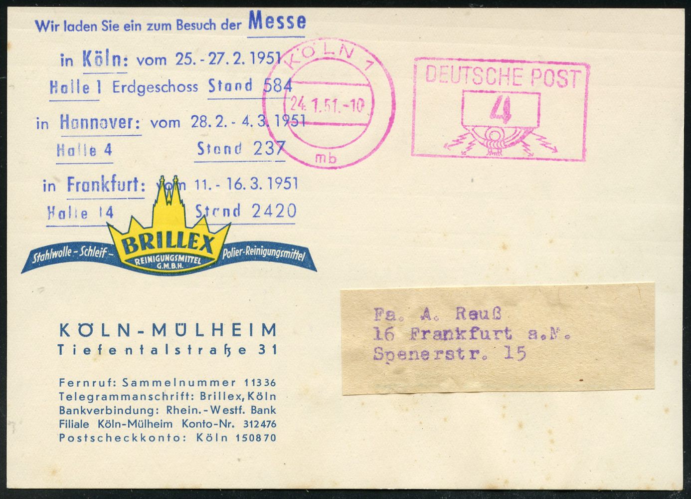 9090 | 18 € | 5000 KÖLN (Post-Freistempel) : KÖLN 1/ mb/ DEUTSCHE POST 1951 (24.1.) viol. PFS "Querrechteck", UB "mb" mit Posthorn, 4 Pf. + viol. Hinweis-HdN: ..Messe-Präsenz auf den Messen in Köln, Hannover und Frankfurt/M. (mit Daten) zweifarbige Reklame-Kt.: BRILLEX REINIGUNGSMITTEL GMBH (rs. Abb.: Stahlwolle), seltene Inl.-Karte (Dü.D-15, Nr. 269 viol.) | ![]() ![]() | |