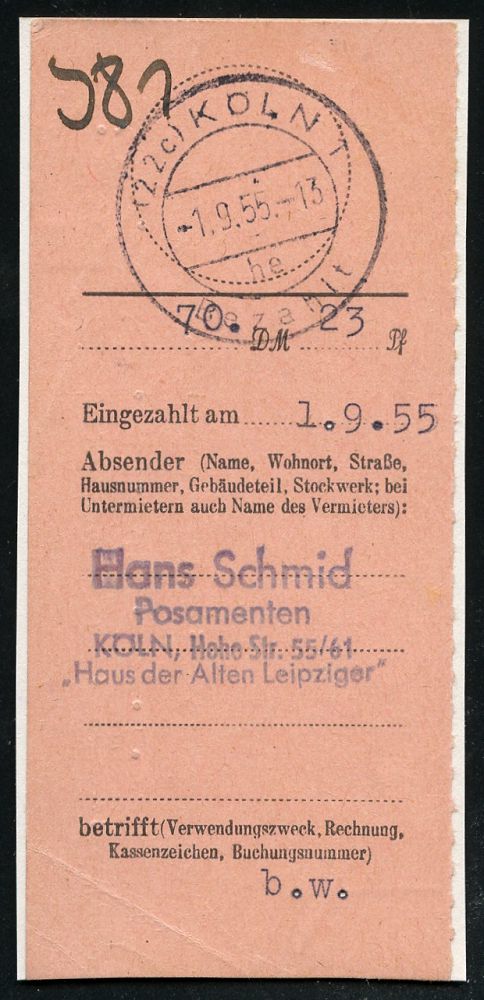 9094 | 10 € | 5000 KÖLN (Post-Freistempel) : (22c) KÖLN 1/ he/ Bezahlt 1955 (1.9.) schwarzer 2K-Hand-PFS mit UB "he" klar auf rosa Postanwesungs-Abschnitt (Dü.A-7, Nr.34 b) | ![]() | |