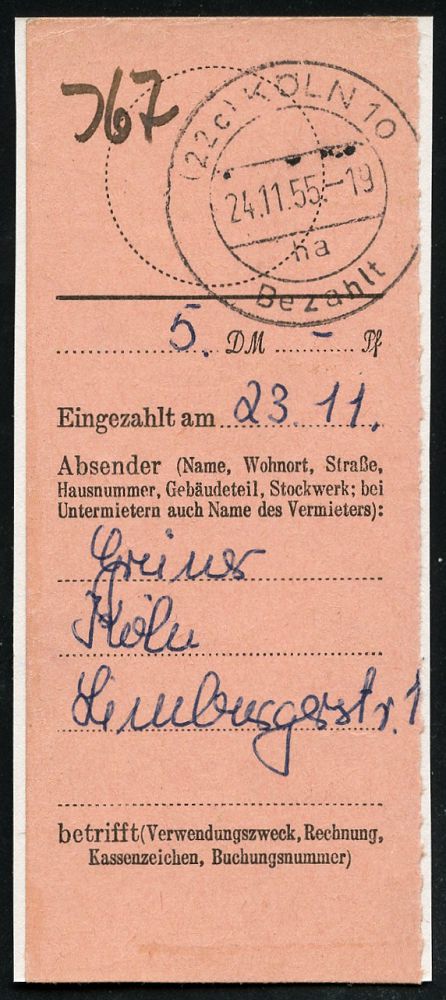 9095 | 10 € | 5000 KÖLN (Post-Freistempel) : (22c) KÖLN 10/ ha/ Bezahlt 1955 (24.11.) schwarzer 2K-Hand-PFS mit UB "ha" klar auf rosa Postanweisungs-Abschnitt (Dü.A-7, Nr.34 b) | ![]() | |