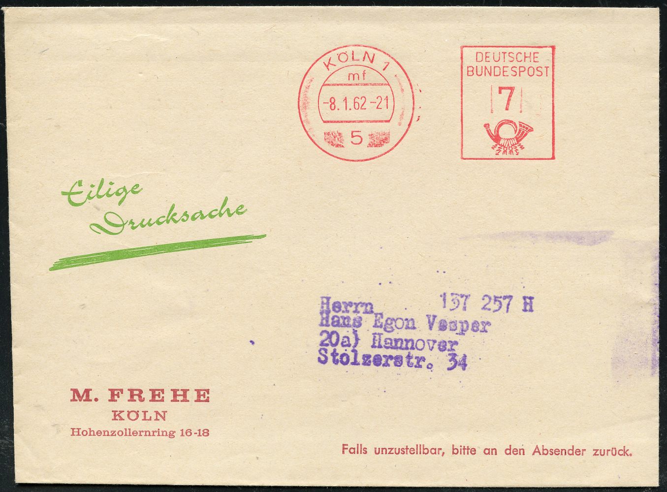 9096 | 15 € | 5000 KÖLN (Post-Freistempel) : 5 KÖLN 1/ mf/ DEUTSCHE/ BUNDESPOST 1962 (8.1.) PFS "Hochrechteck" Posthorn mit neuer PLZ u. Uhrzeit, UB "mf" , zweifarbiger Firmen-Bf: M. FREHE.. (Dü.D-19 = Erstjahr neue PLZ!) | ![]() | |